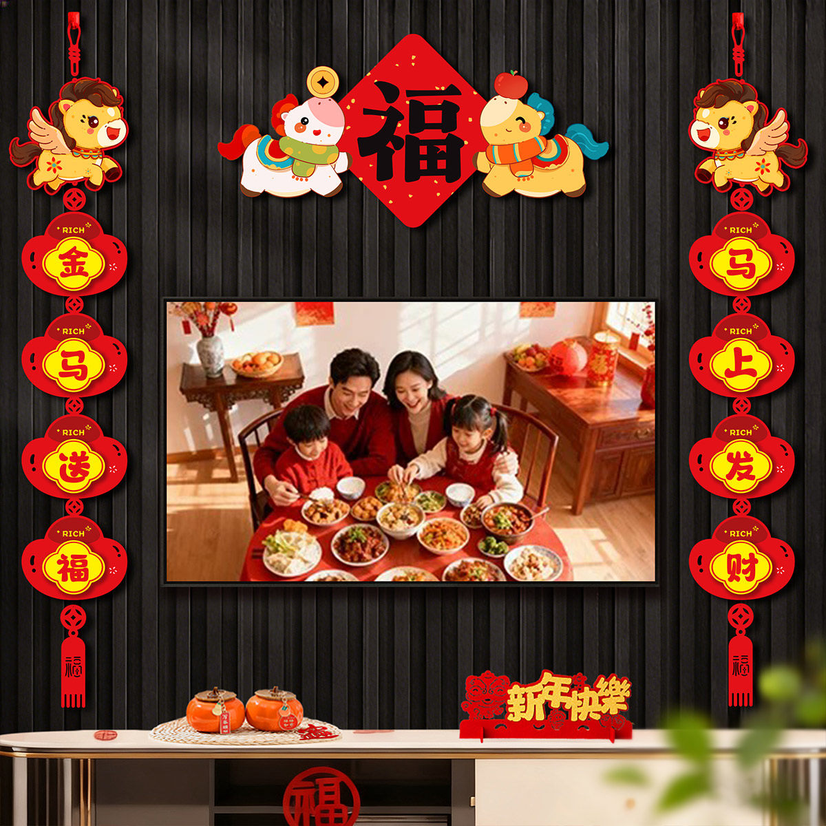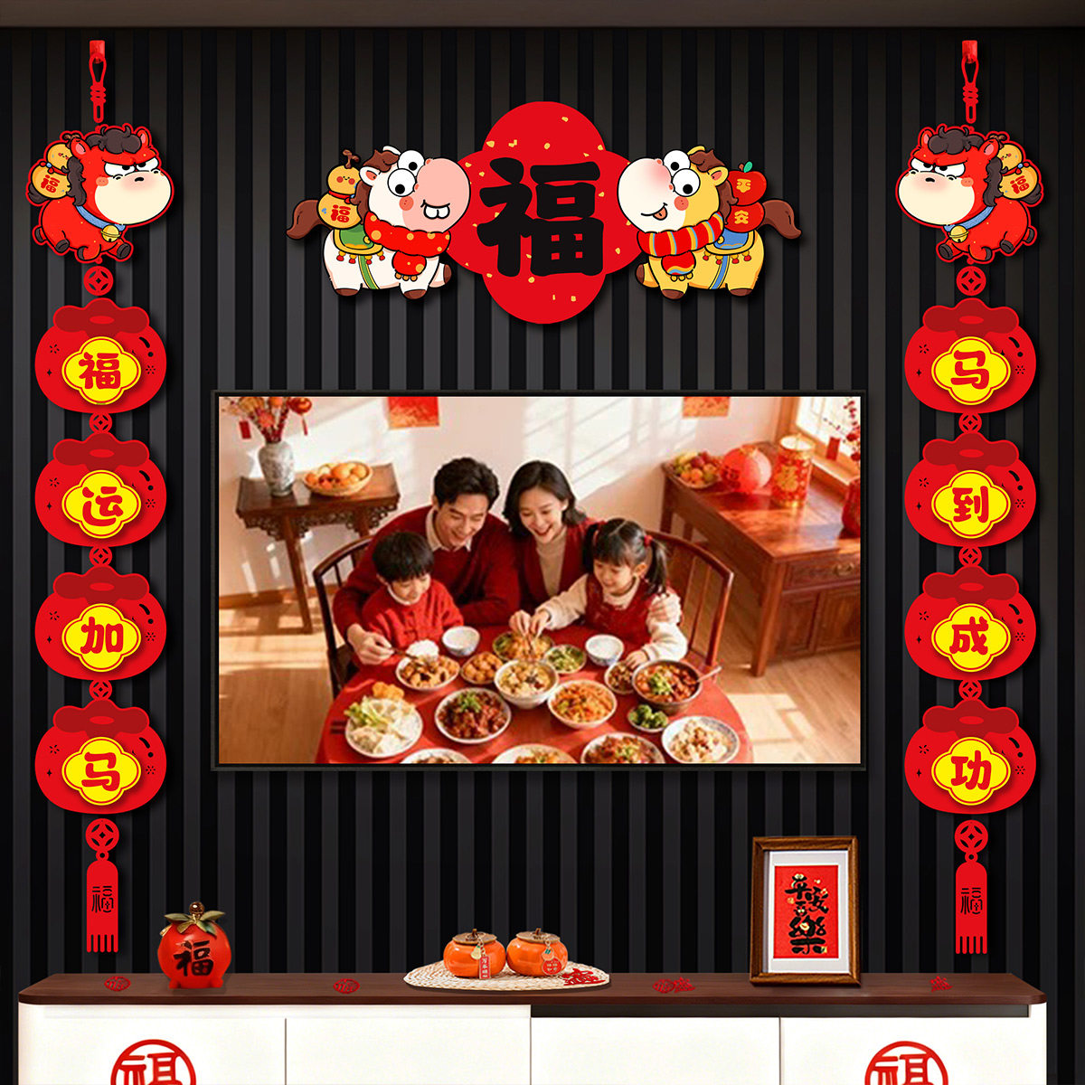 📚 新年客厅电视背景墙装饰2026马年绒布中国结挂饰对联春节福字挂件