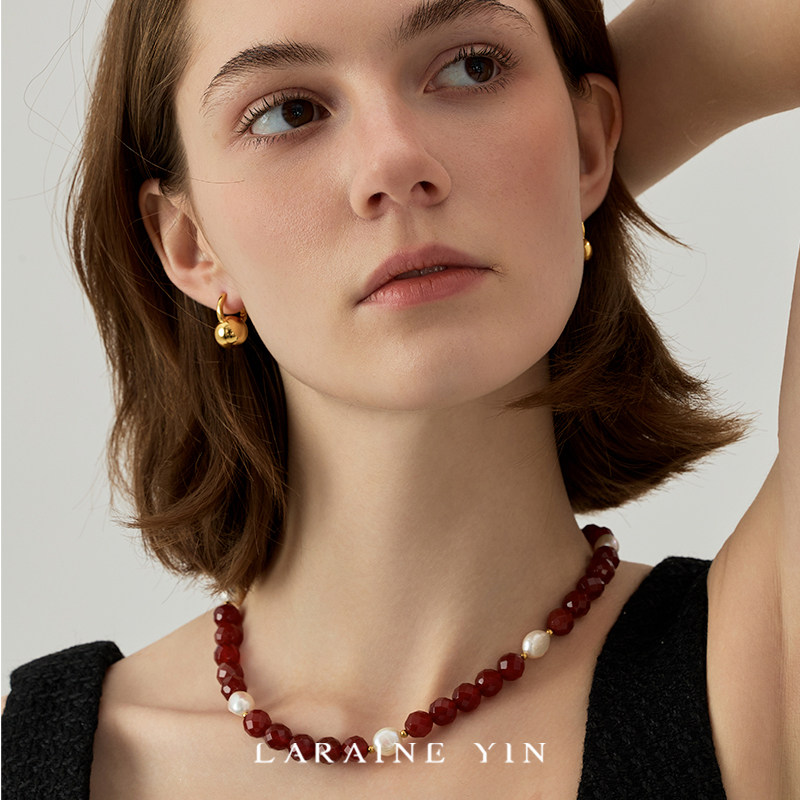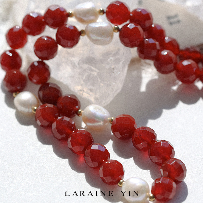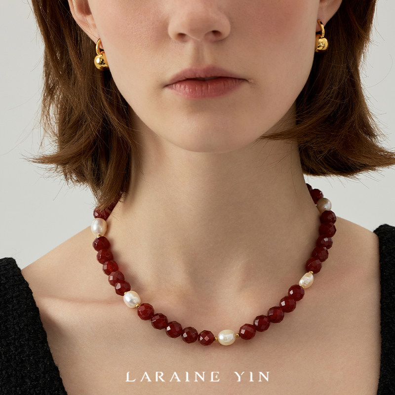 📚 原创小众轻奢夸张红玛瑙项链珍珠巴洛克锁骨链红色颈链显白
