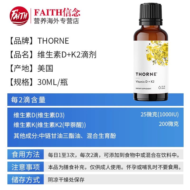 📚 Thorne悦恩维生素D3k2滴剂成人30ml液体钙维他命D3成人骨骼保健品
