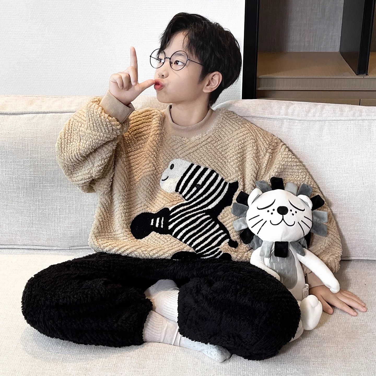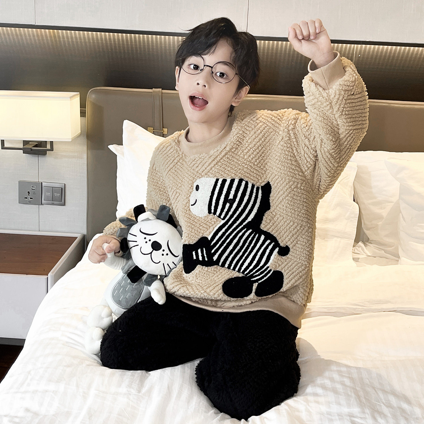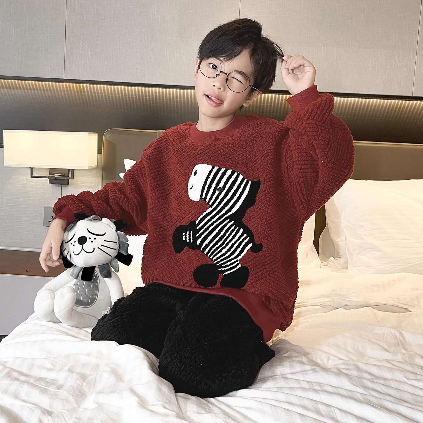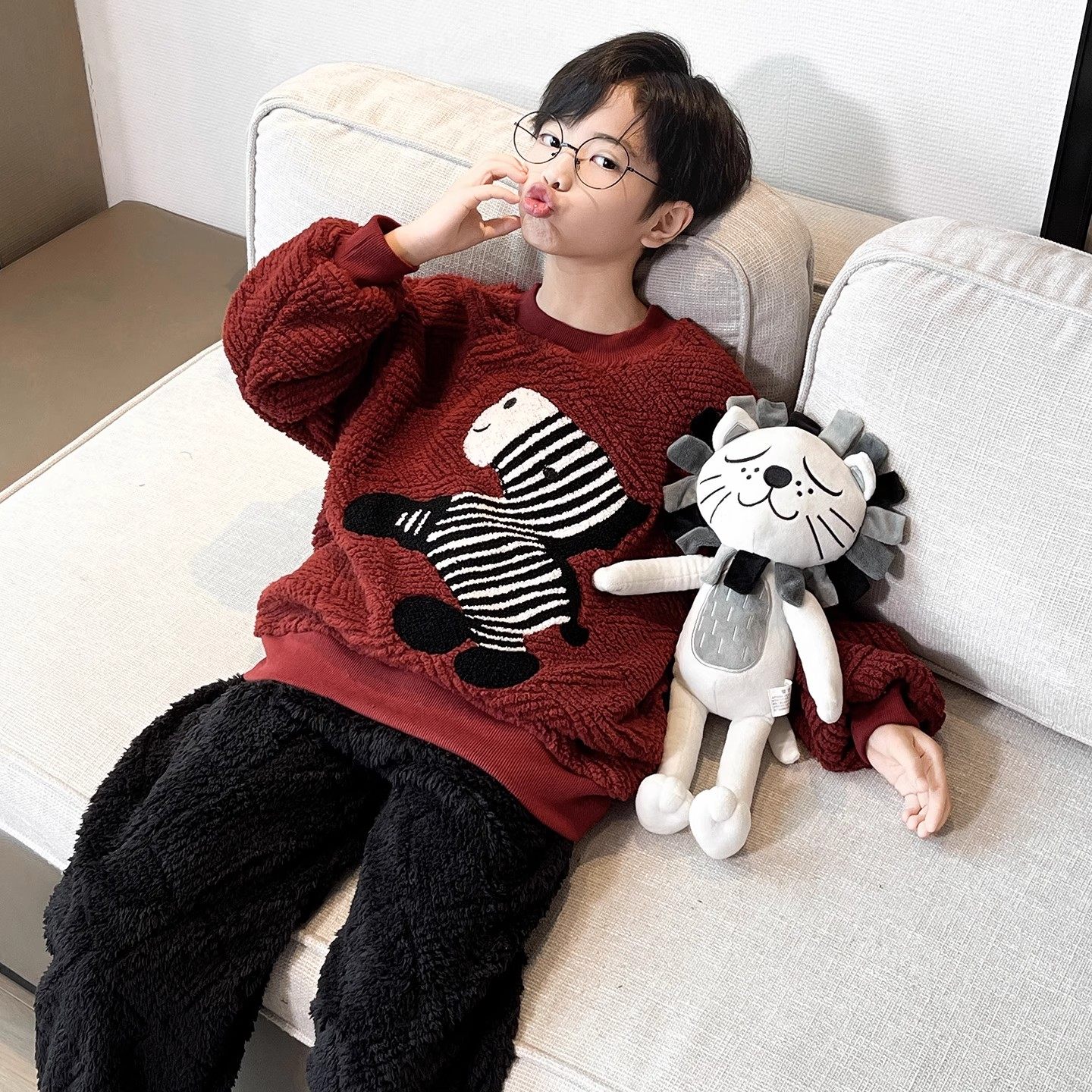 📚 法国Uamtor男童秋冬珊瑚绒睡衣套装2025新款加绒红色法兰绒家居服