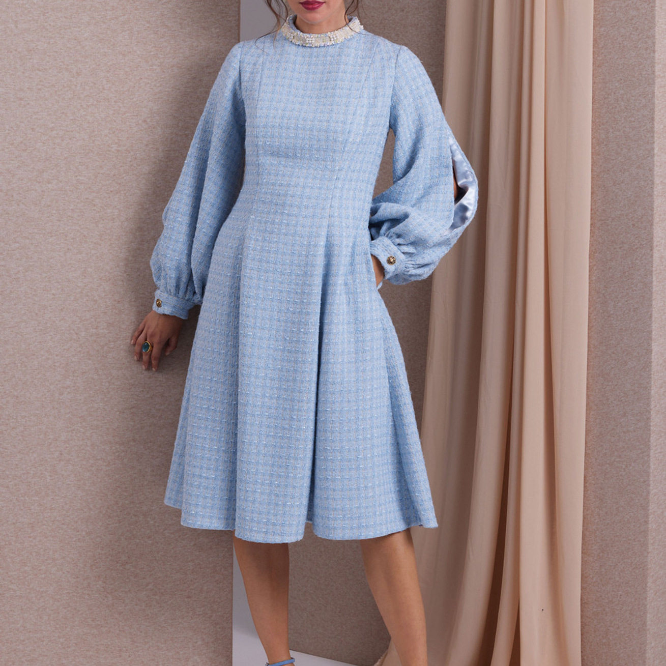 📚 天蓝色花呢小香风长袖A摆连衣裙春秋欧美定制做 tailor dresses