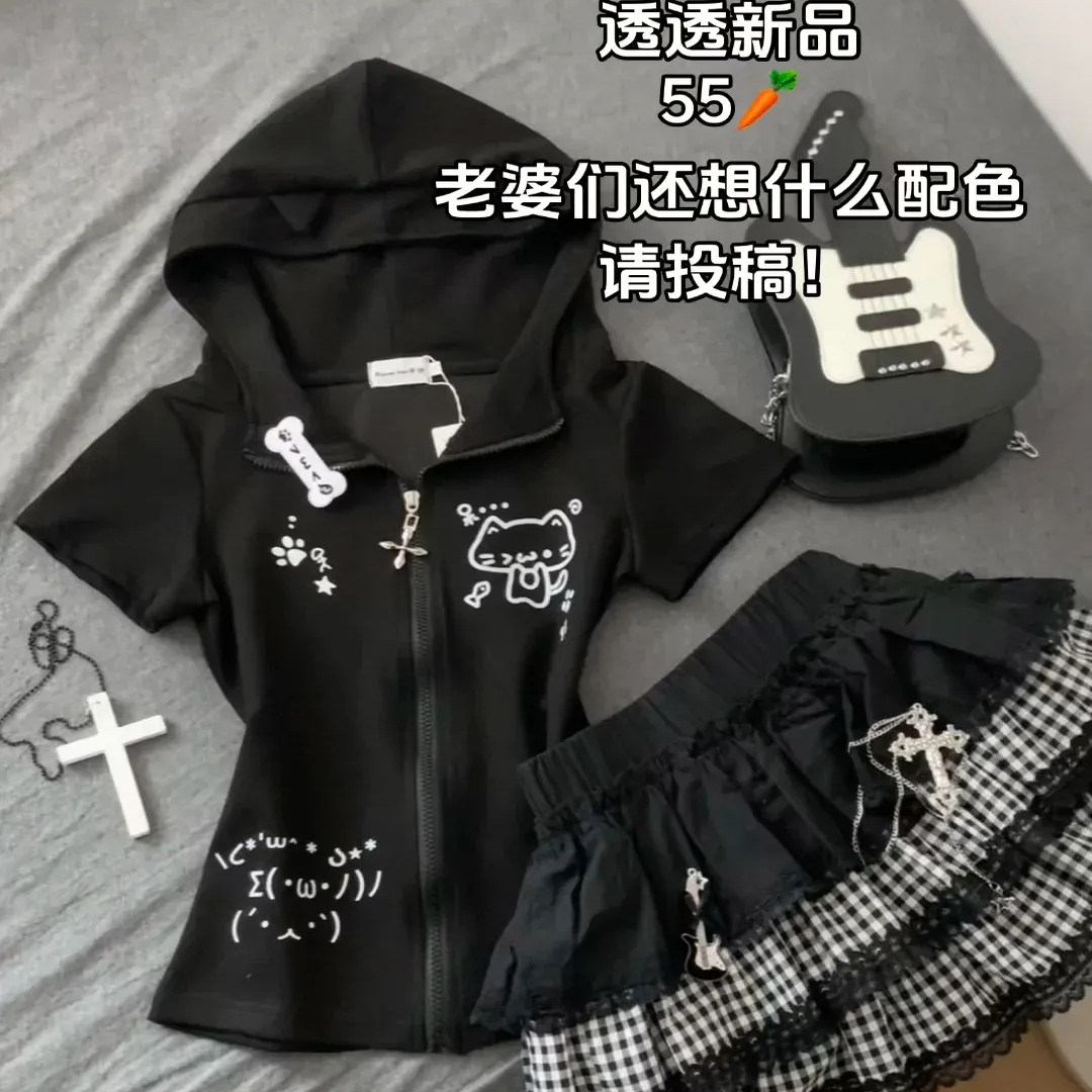 📚 日系可爱辣妹修身亚文化夏T恤女猫耳朵连帽短袖修身显瘦正肩外套
