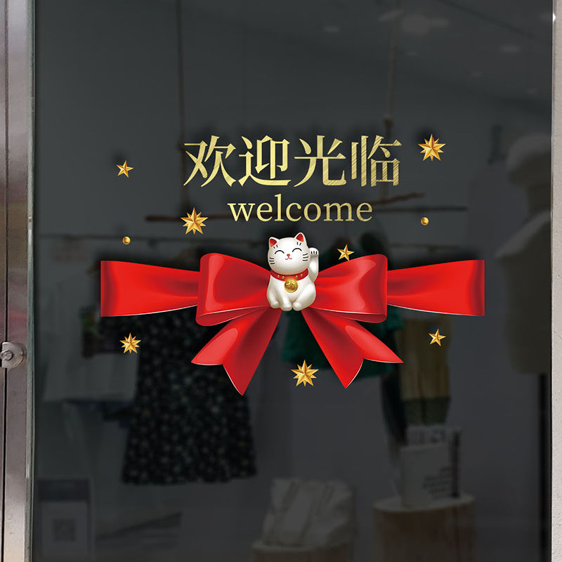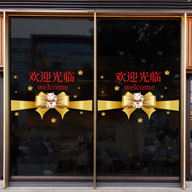 📚 欢迎光临装饰贴纸饭店酒店玻璃防撞门贴奶茶店橱窗招财猫静电贴画