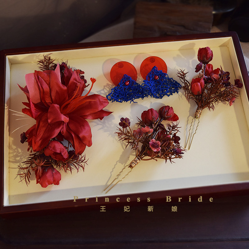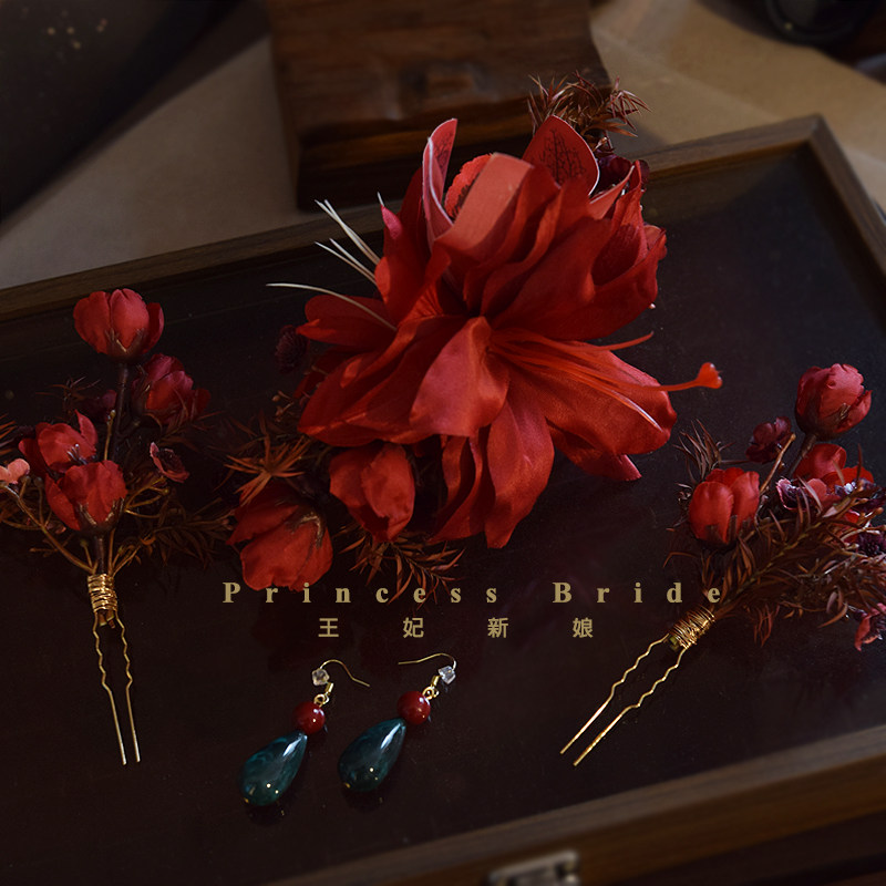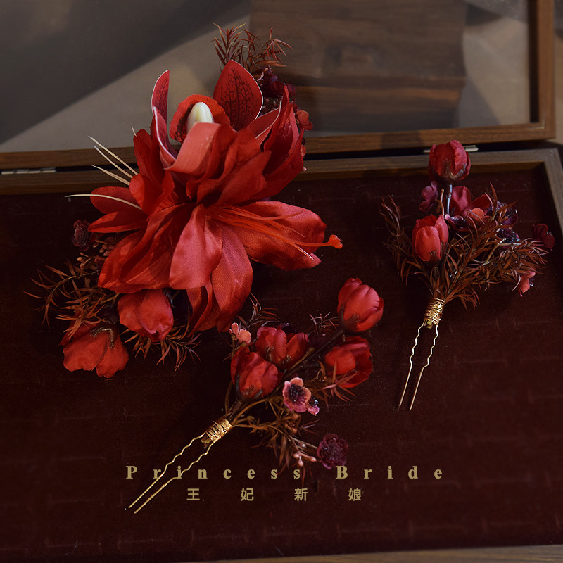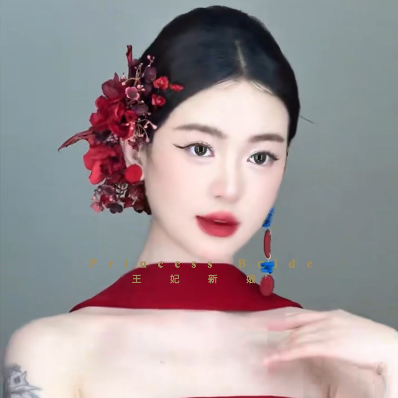 📚 新中式新娘旗袍超仙红色花朵头饰发夹发饰敬酒服侧边盘发造型配饰