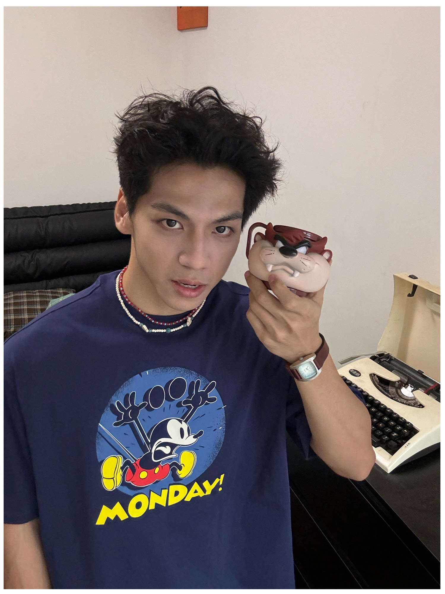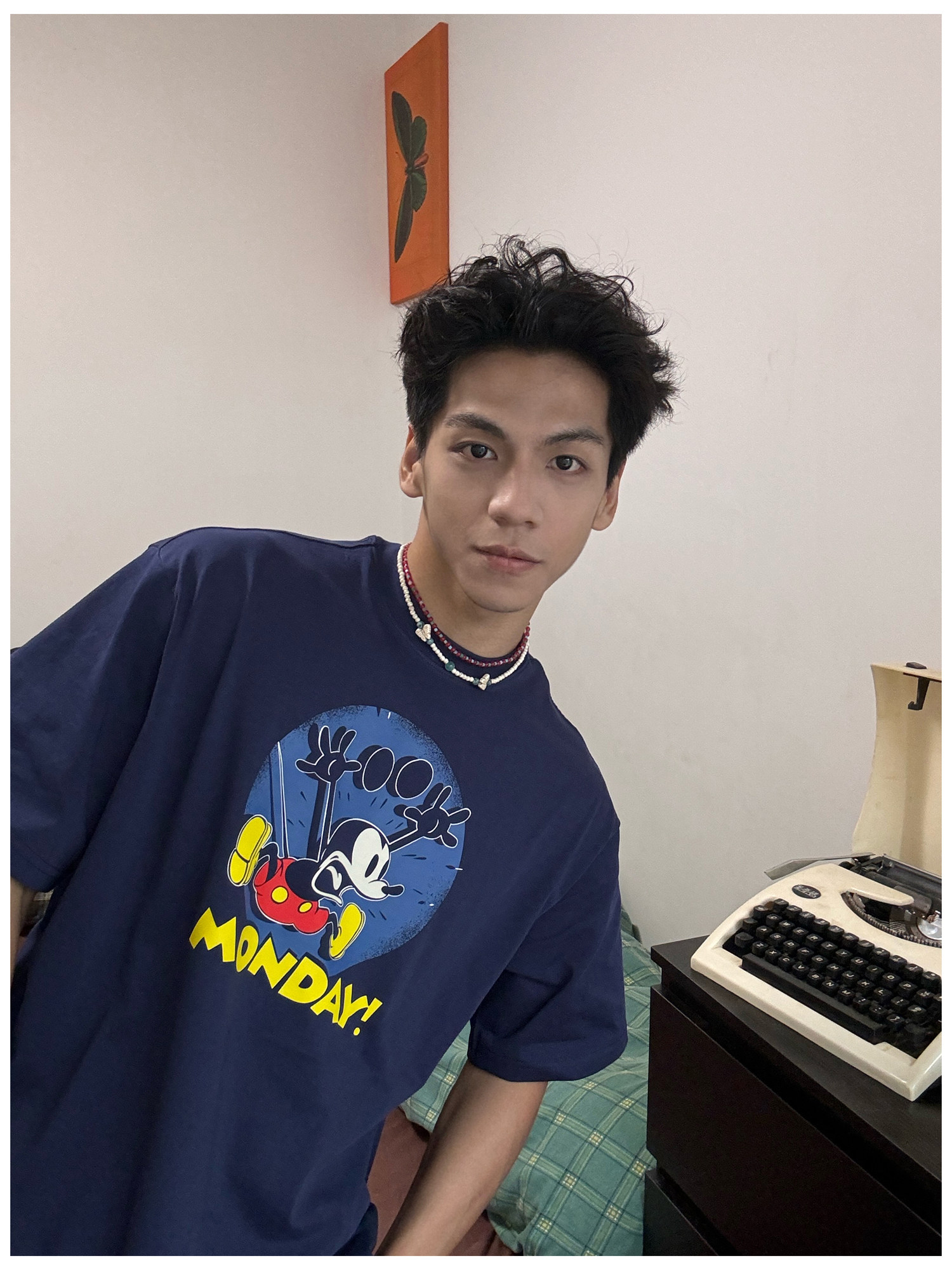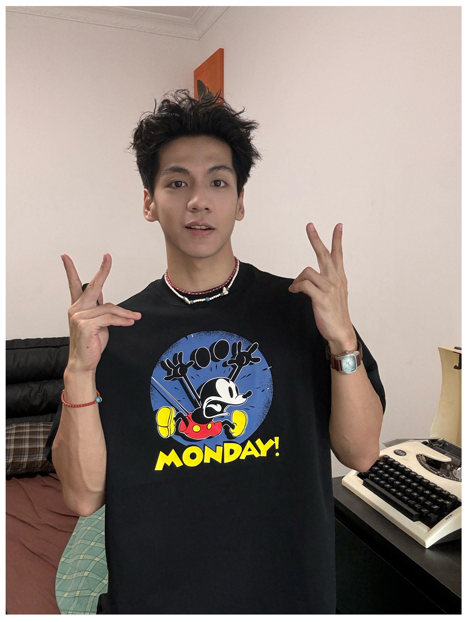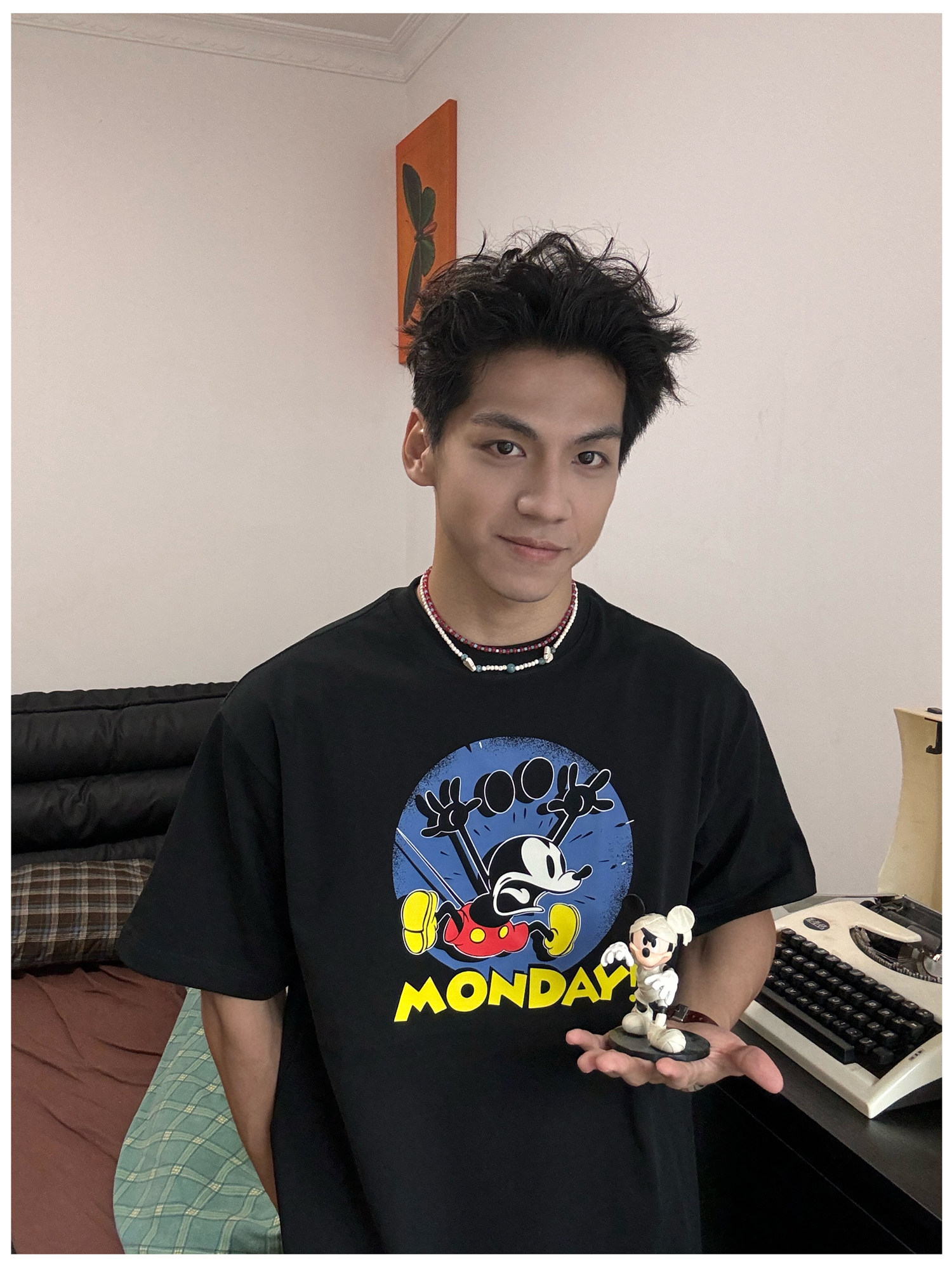 📚 讨厌星期一 小众趣味卡通米老鼠印花男女款情侣小领口宽松短袖T恤