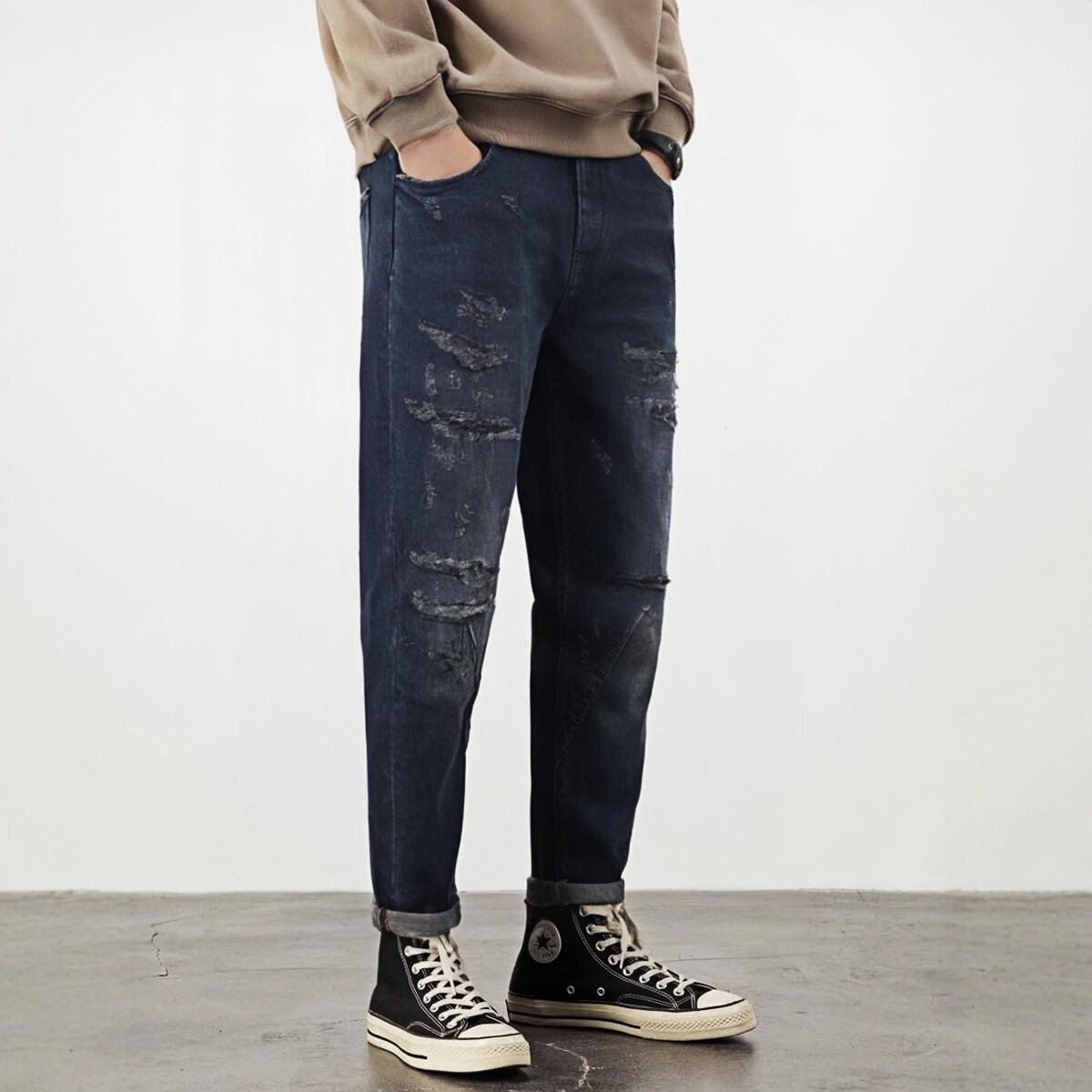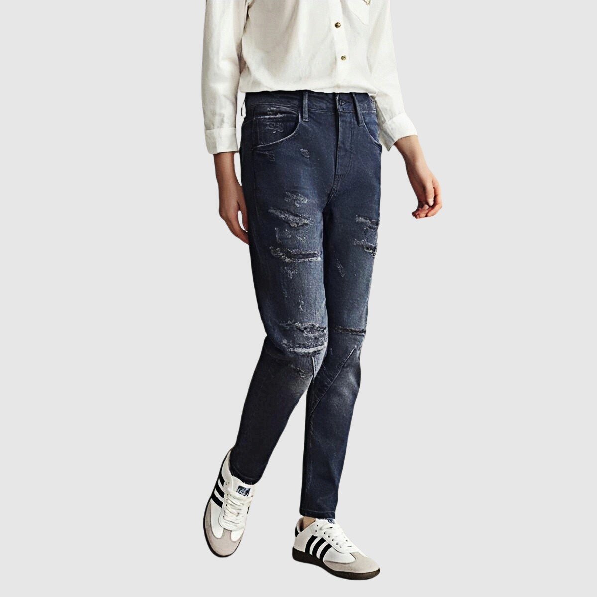 📚 秋冬牛仔裤厚款ABLEJEANS男女长裤深色锥形裤破洞休闲BF男朋友裤