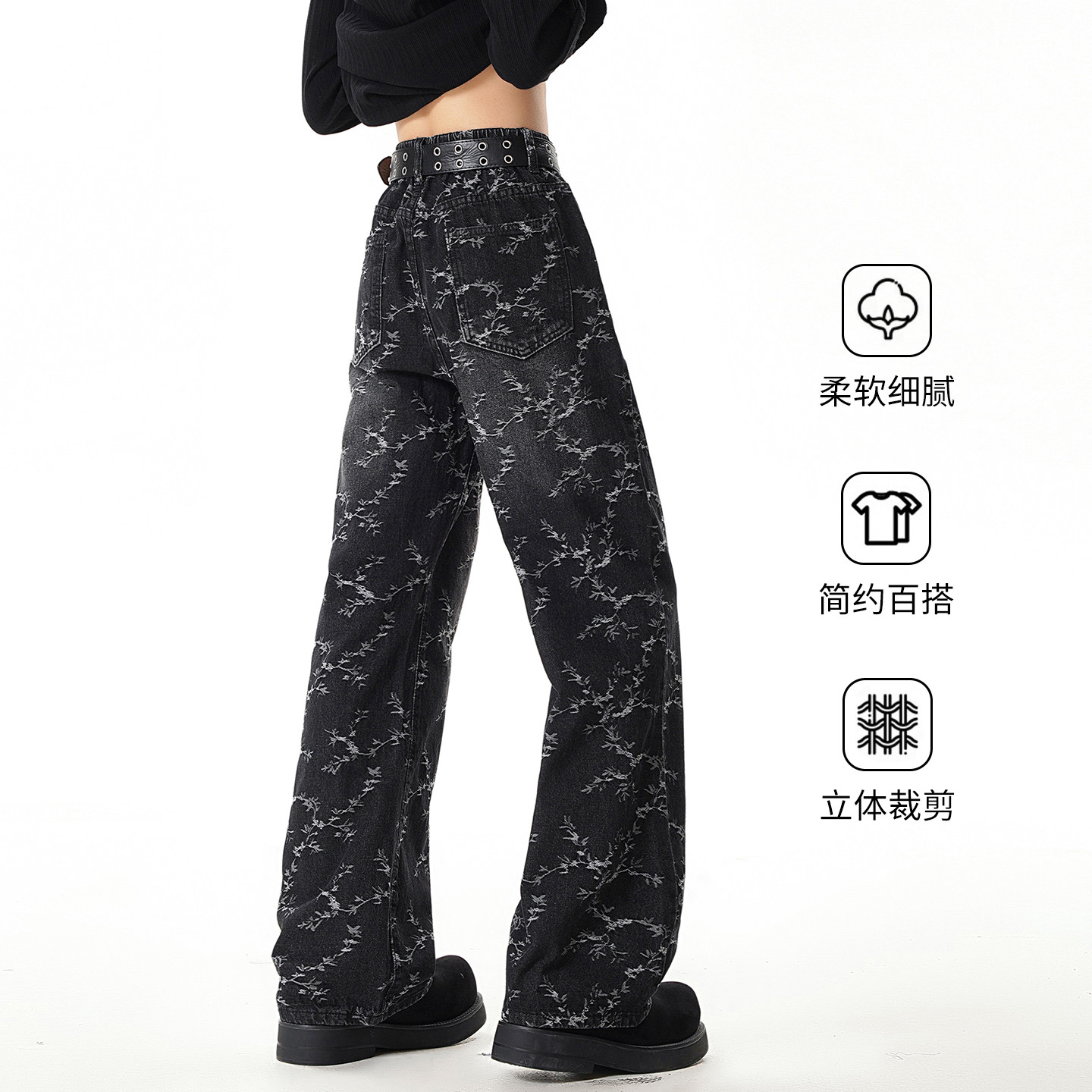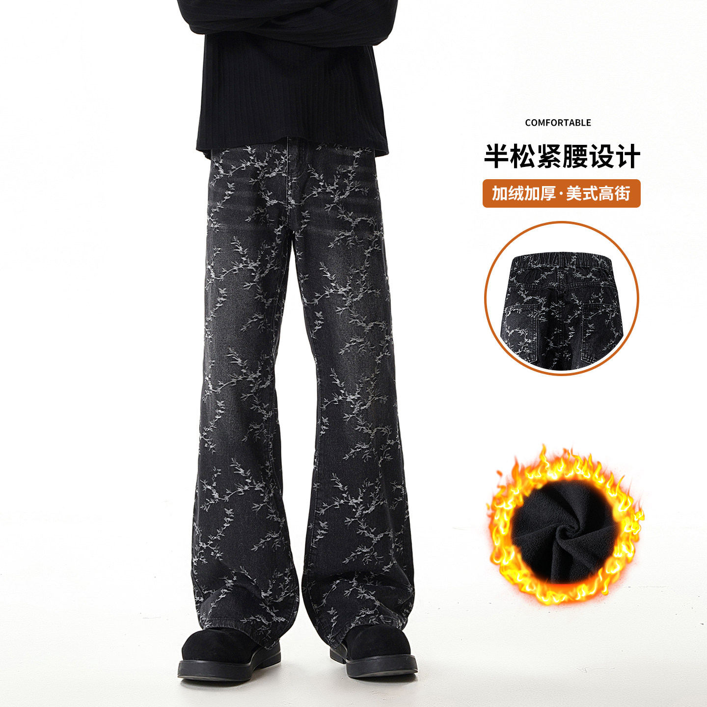 📚 美式嘻哈风荆棘提花微喇牛冬季仔裤男加绒保暖修身直筒阔腿长裤子