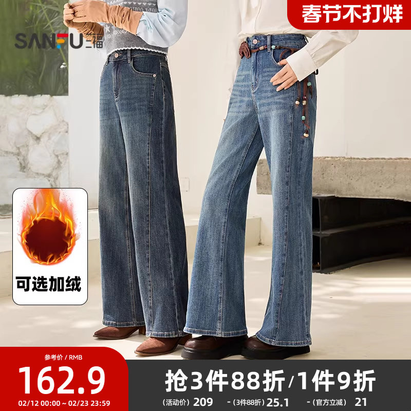 📚 三福牛仔长裤2026新款春季时尚复古微喇裤蓝色喇叭裤子女装504510