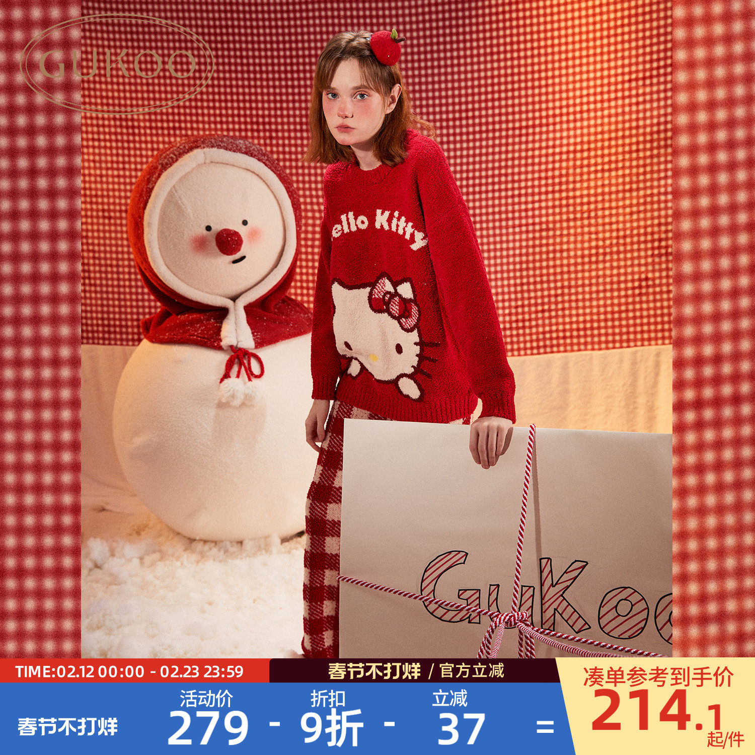 💥Gukoo果壳半边绒睡衣女冬HelloKitty联名新年红女家居服D,冬日温暖新选择!💖
