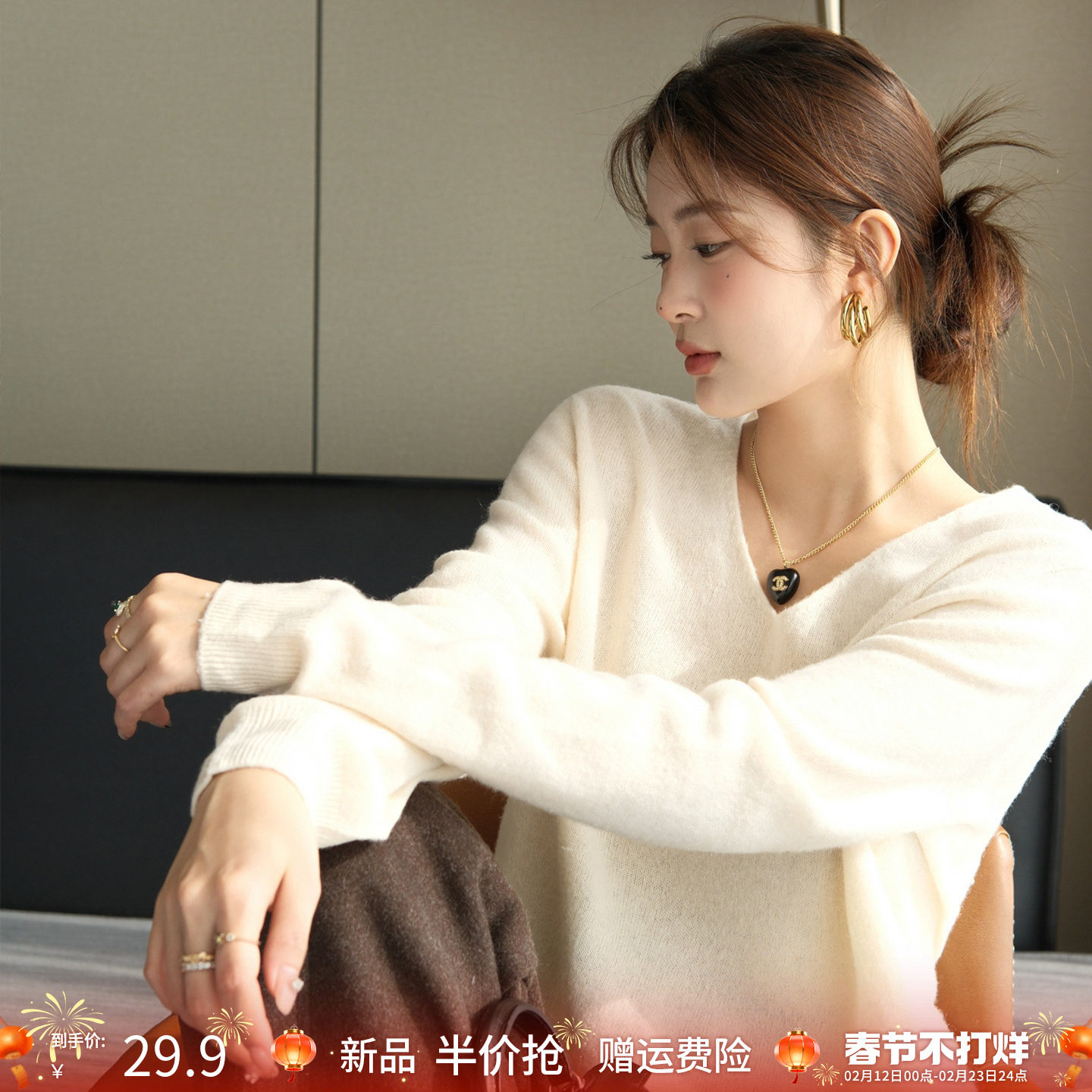 49¥ CZ028 y8GpUms1e6c¥ https://m.tb.cn/h.7xdafoR 龙妹白色V领羊绒打底衫女内搭外穿毛衣2026春季新款针织宽松上衣 --------------------- 【原售价】159.8元 【现售价】79.9元。