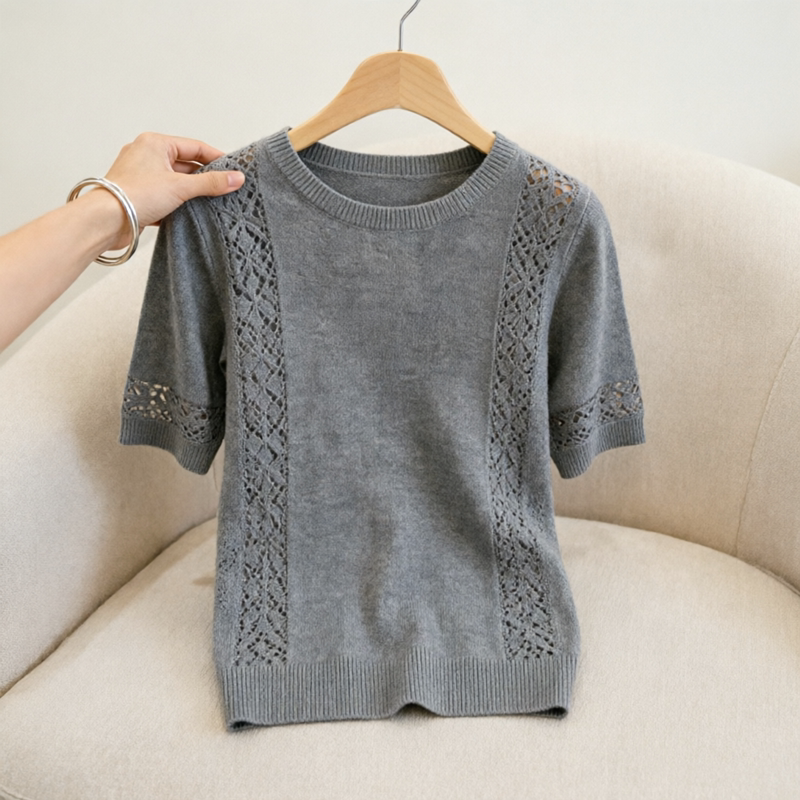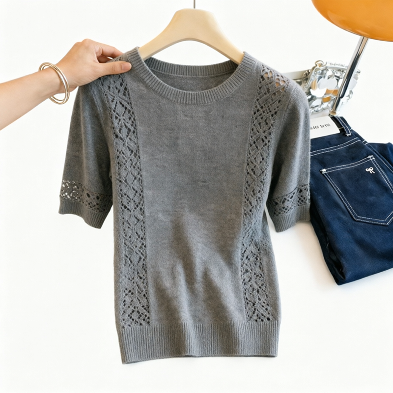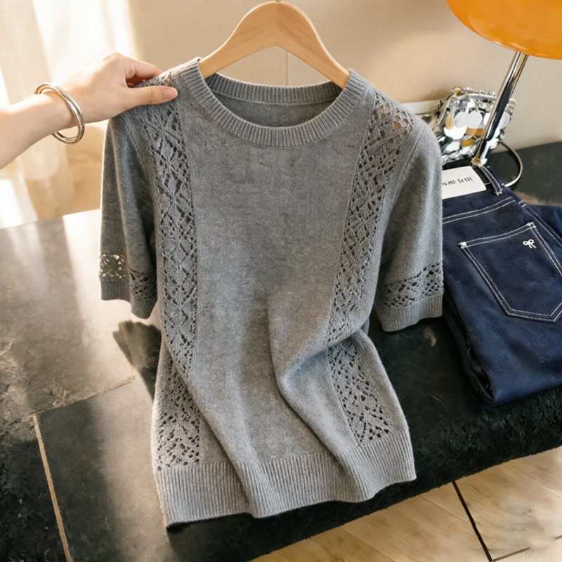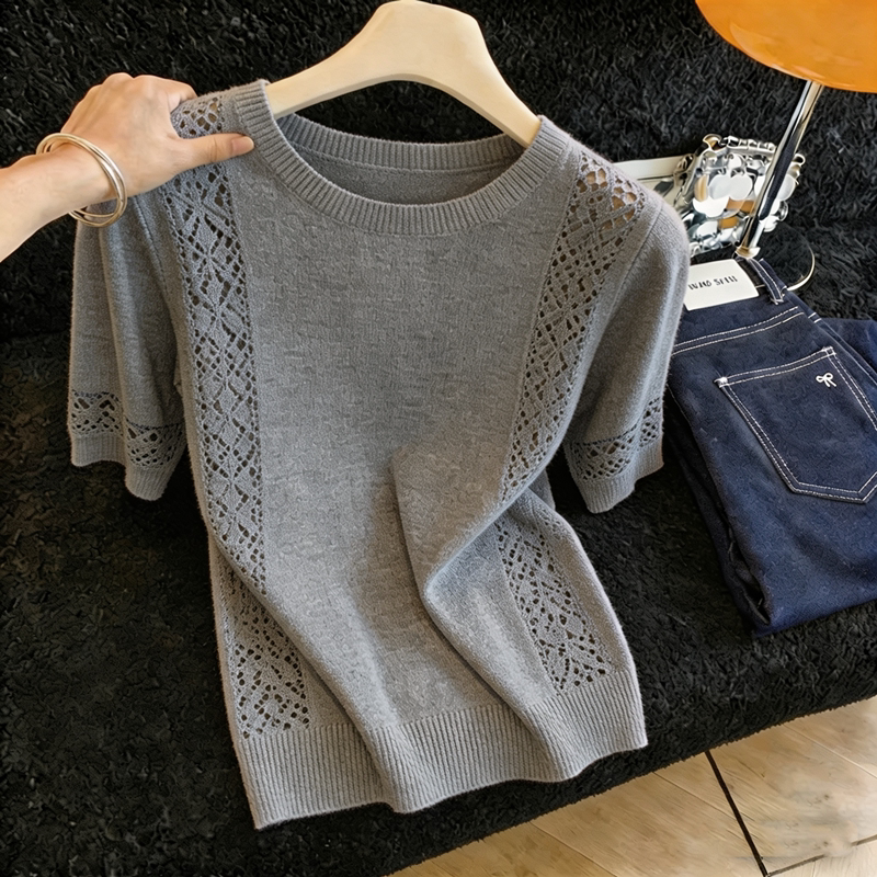 📚 胖MM复古风洋气圆领短袖针织衫女夏季新款超好看勾花镂空显瘦上衣