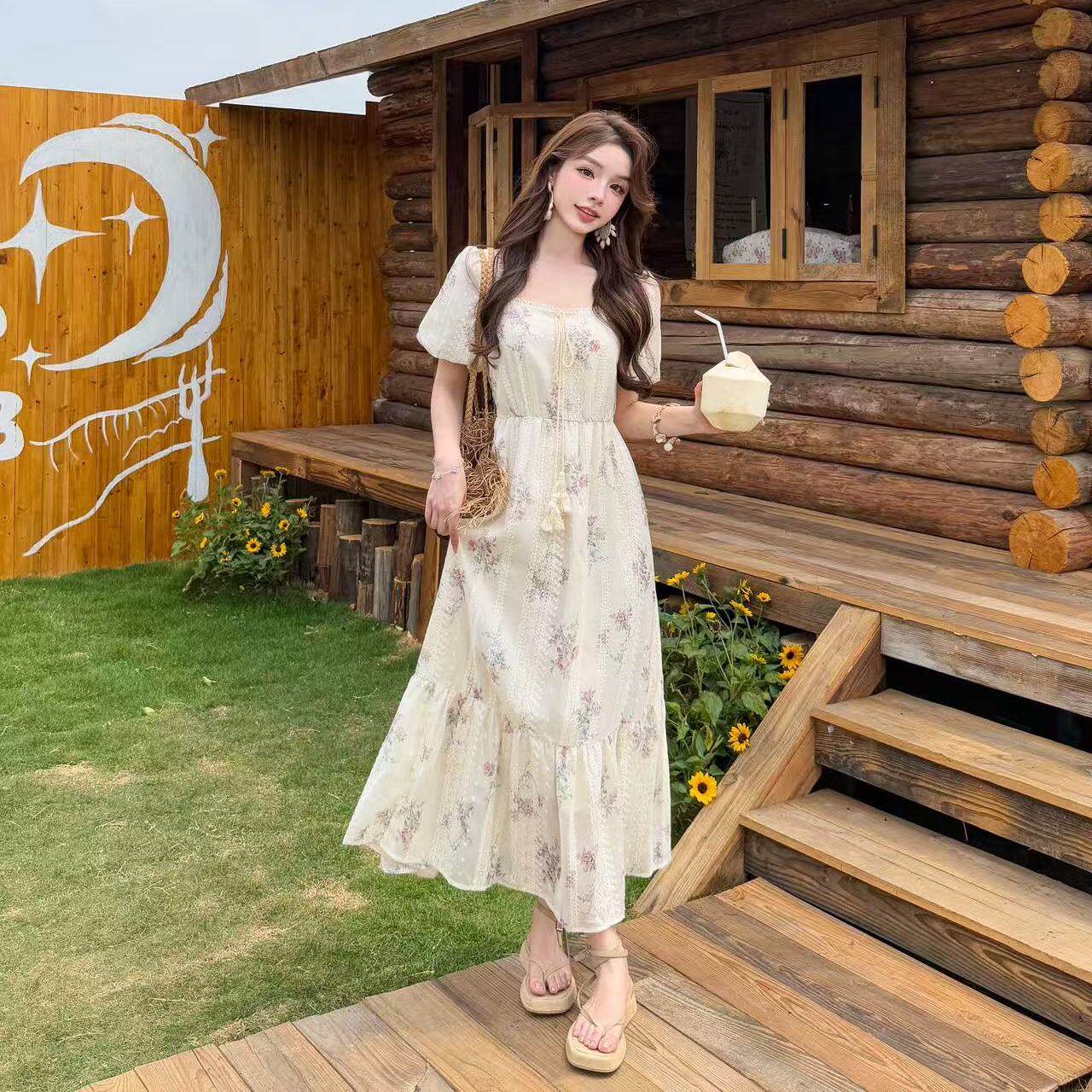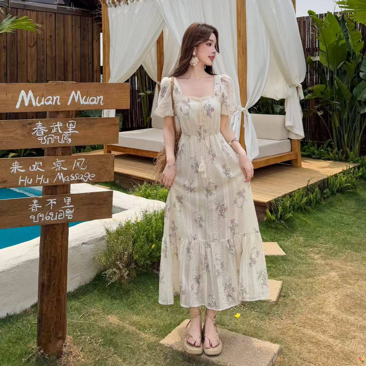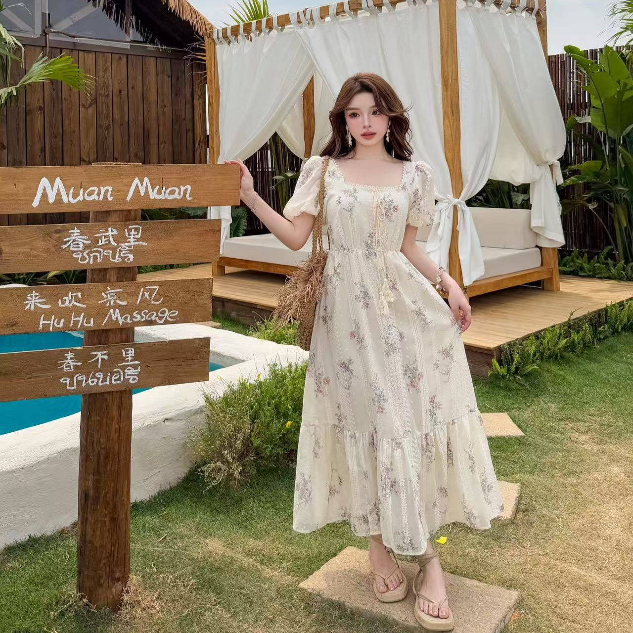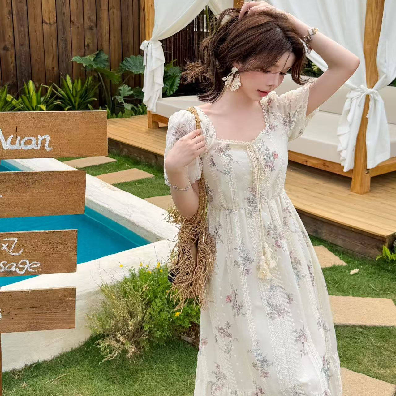 📚 韩版ulzzang夏季新款法式气质时尚方领系带收腰显瘦碎花连衣裙女