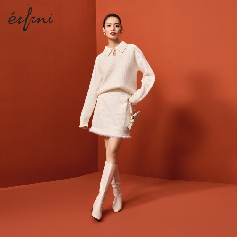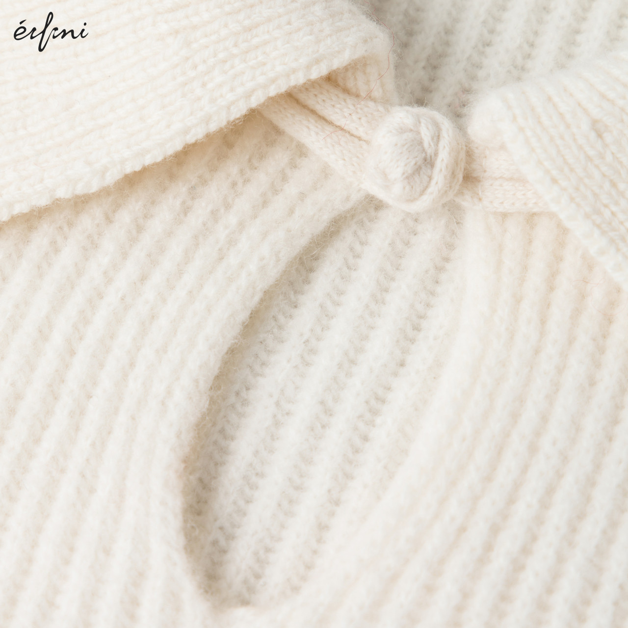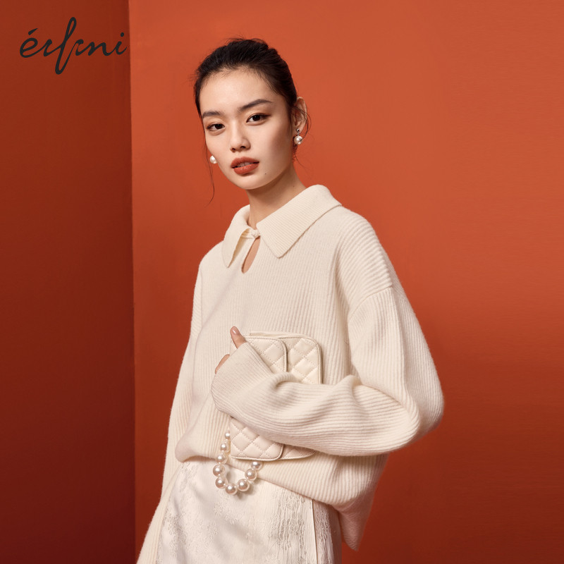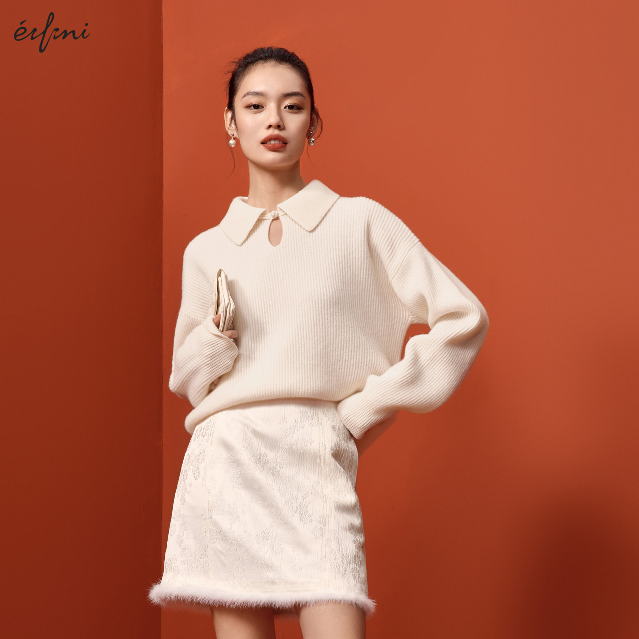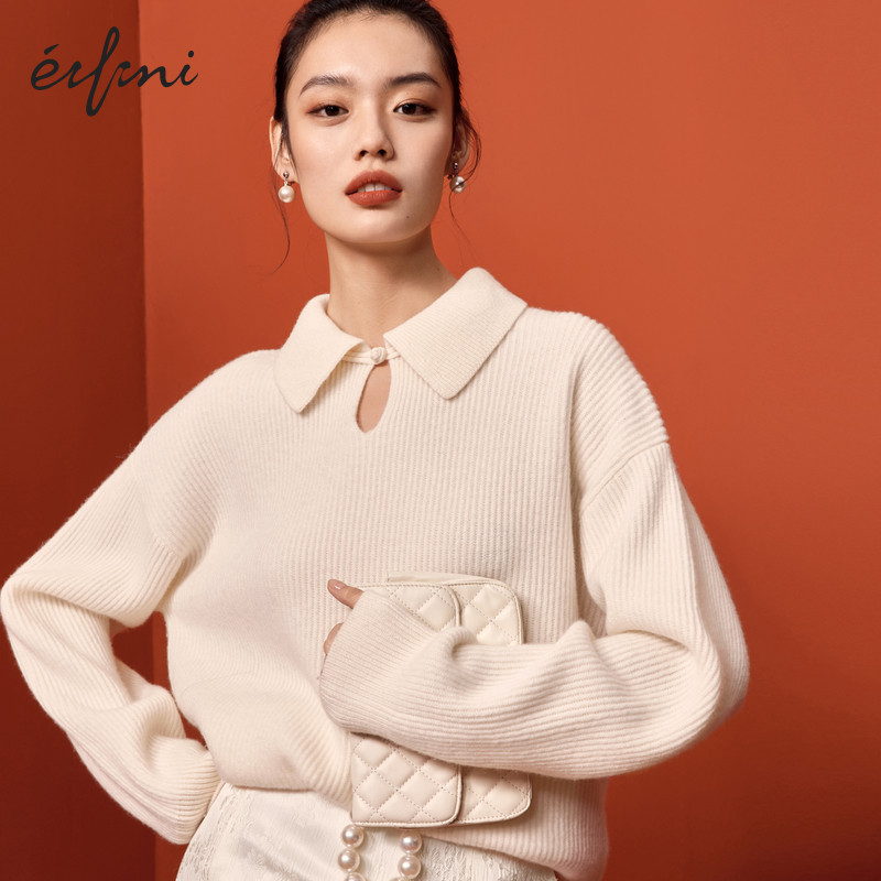 📚 伊芙丽outlets店米色盘扣镂空羊毛针织衫春秋新年圣诞套头毛衫女