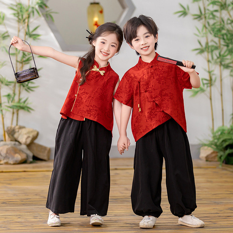📚 夏季薄款短袖男童汉服中国风红色唐装男孩古装新中式幼儿园演出服