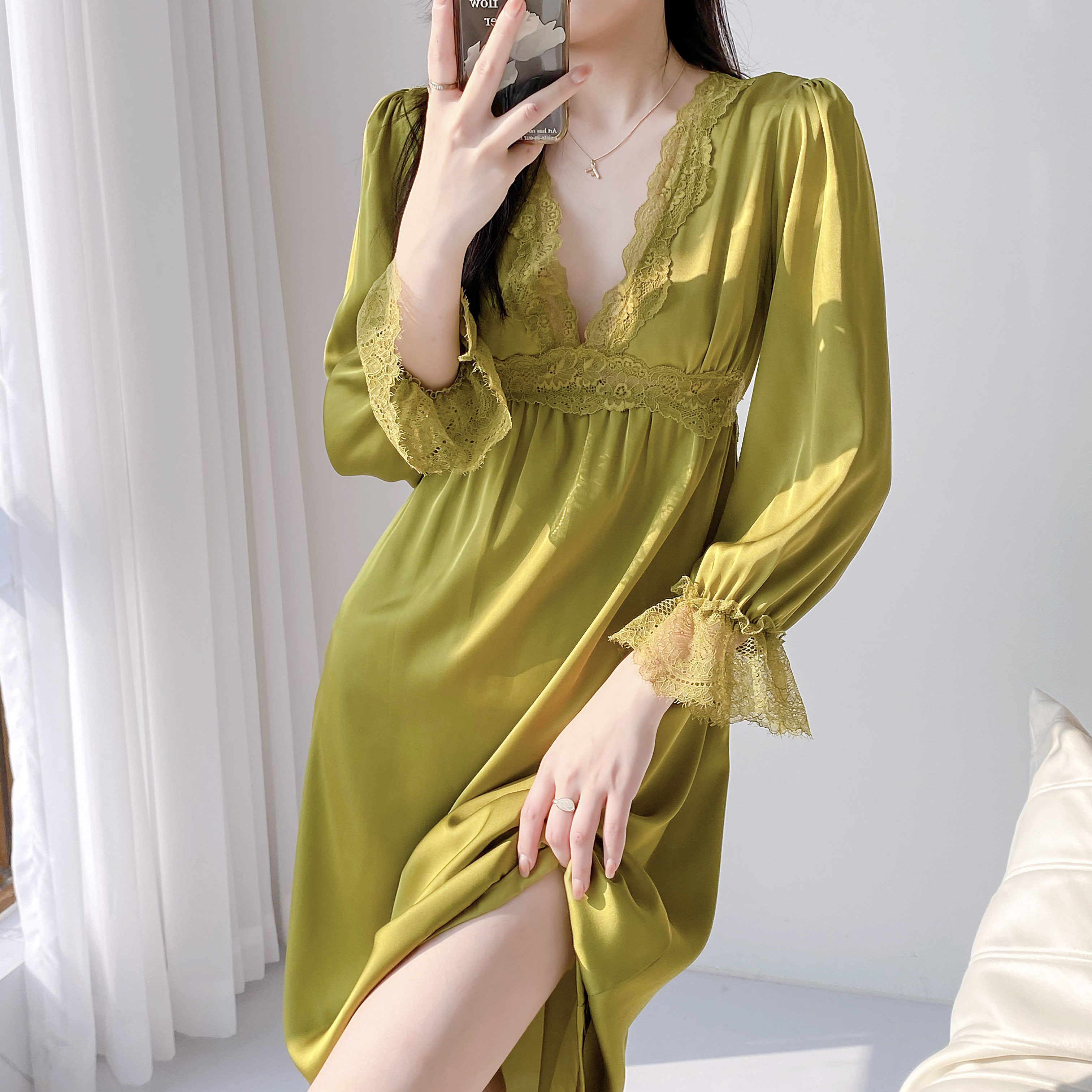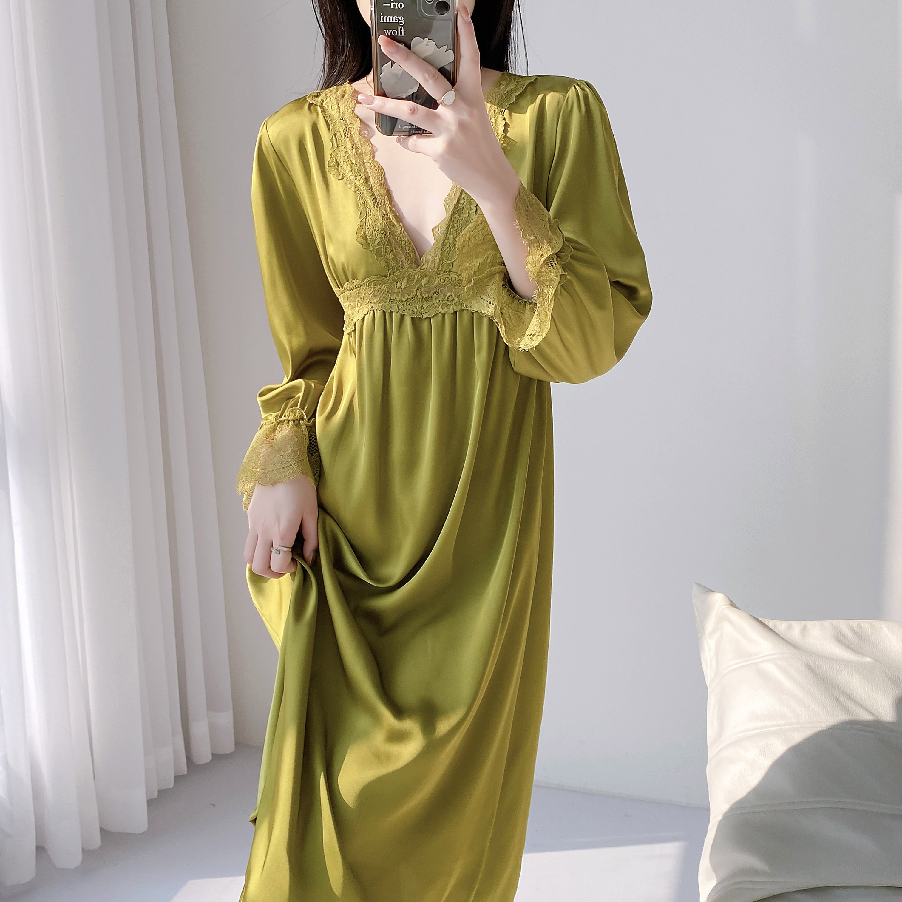 📚 仙女冰丝绸睡裙女春秋款长裙带胸垫性感长袖睡衣过膝长款家居服