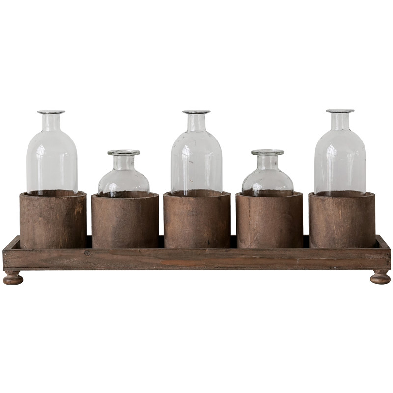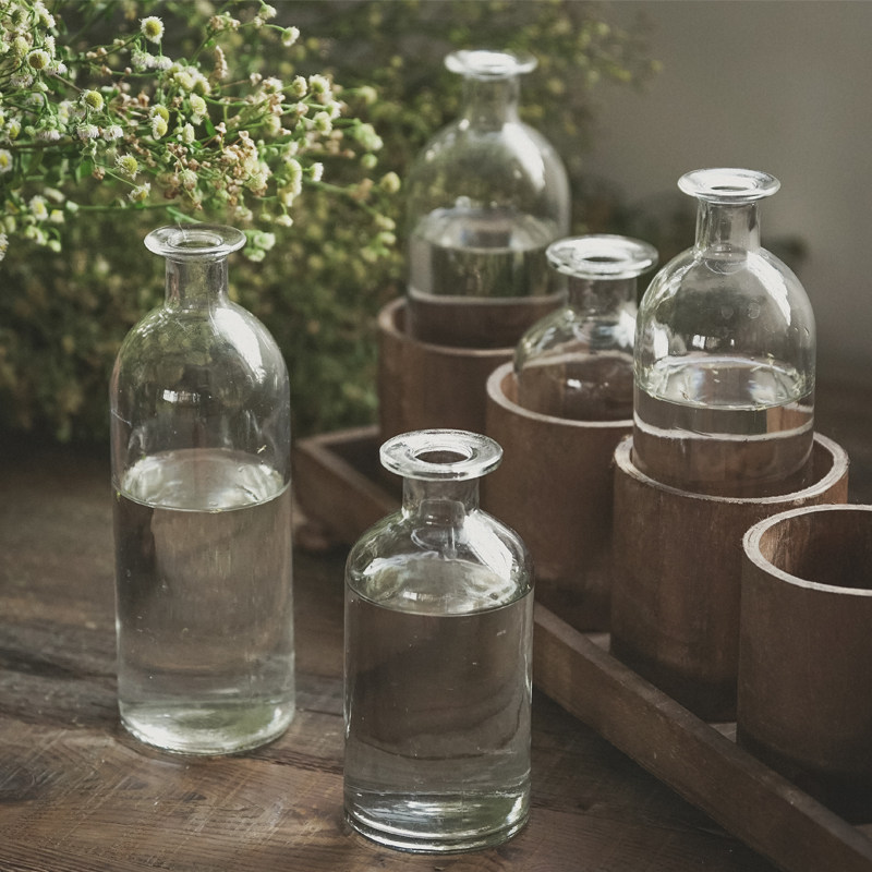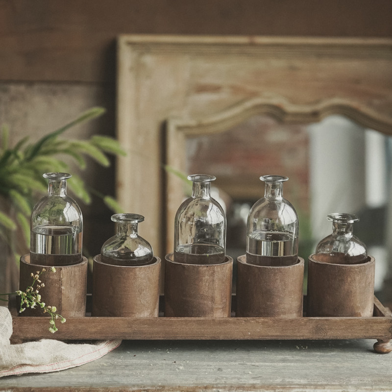 📚 一排5个小花瓶套装实木复古做旧底座透明玻璃花瓶客厅插花花器