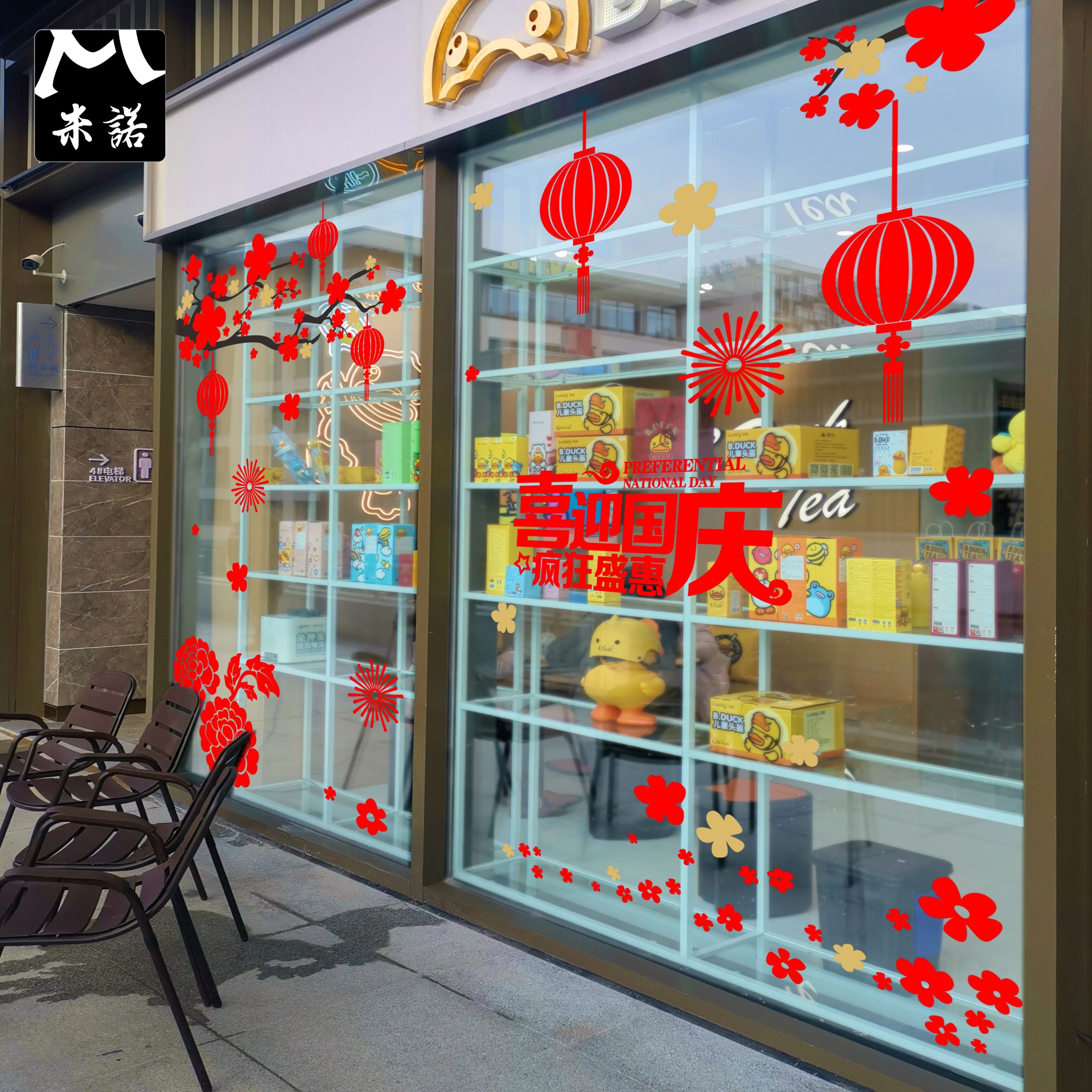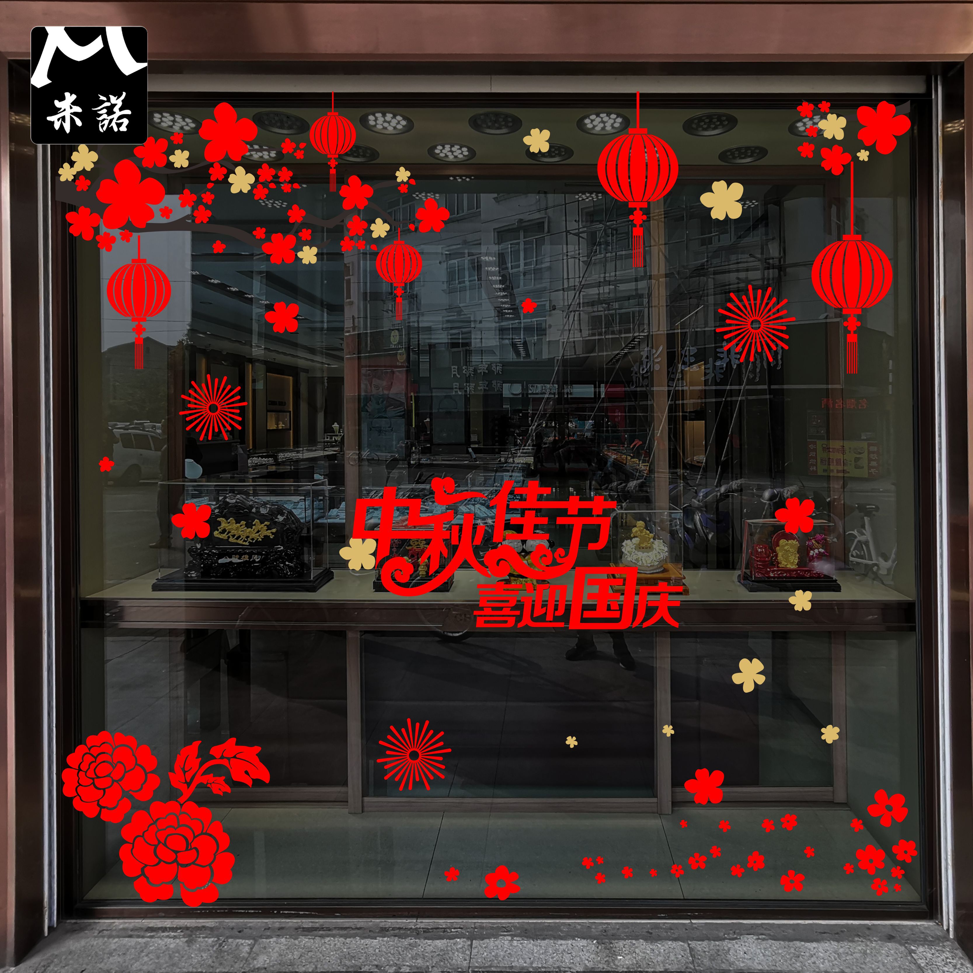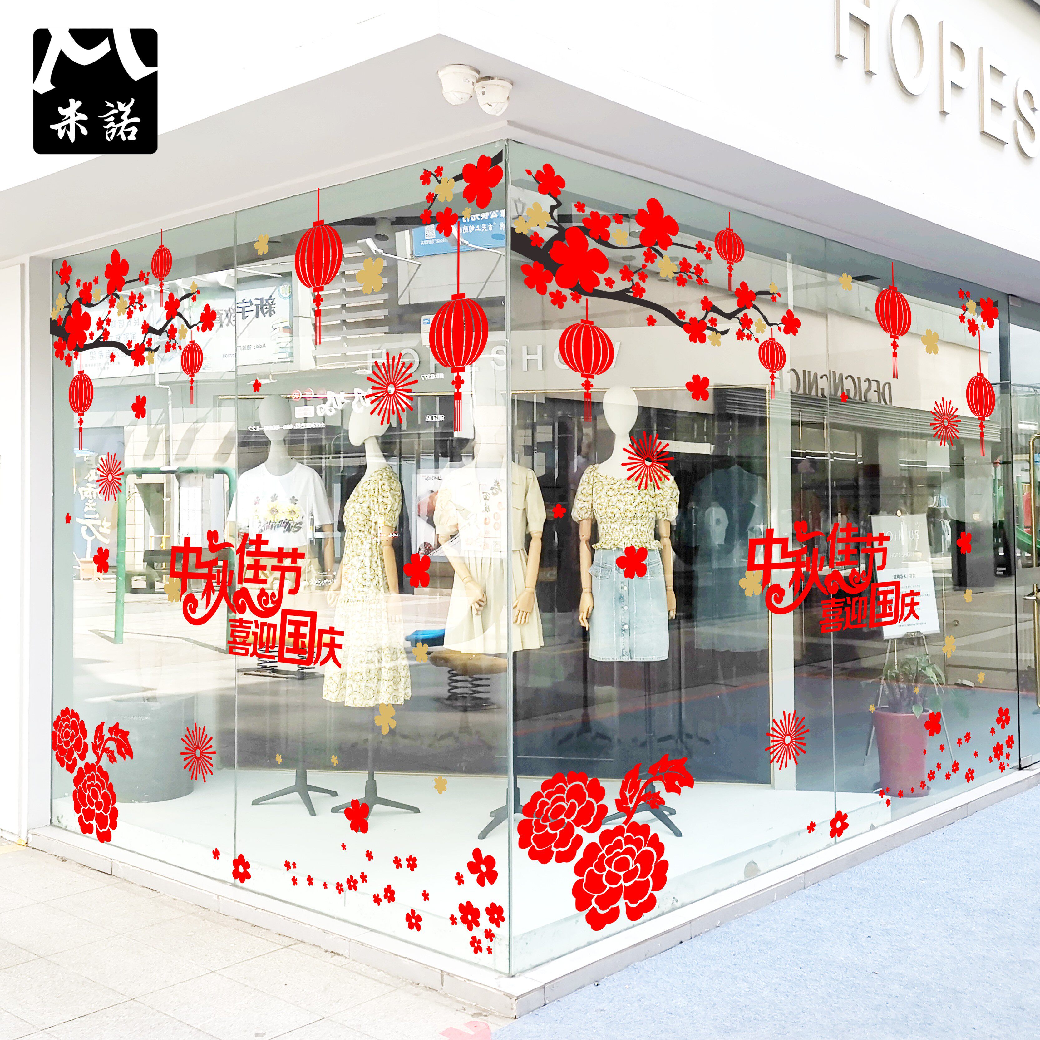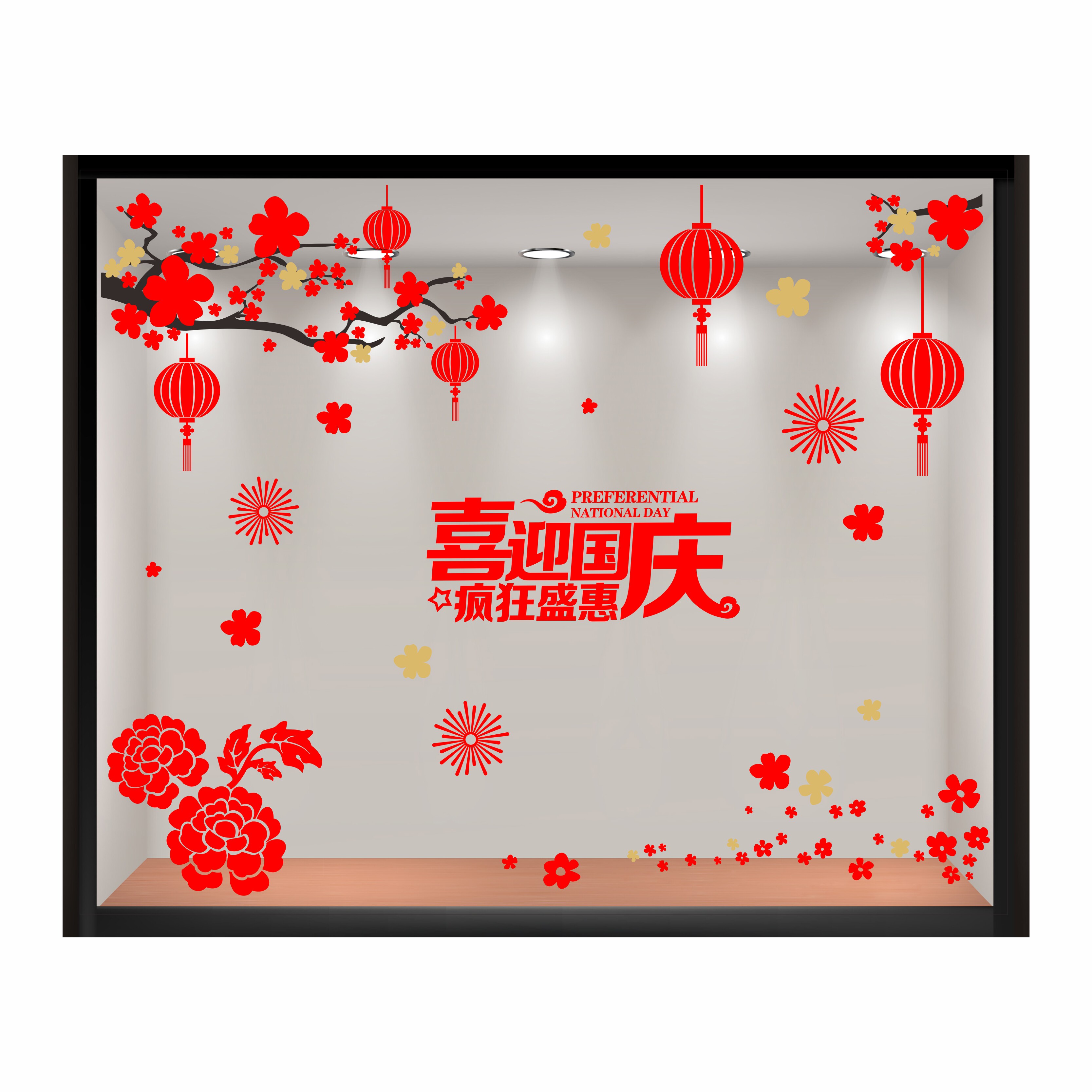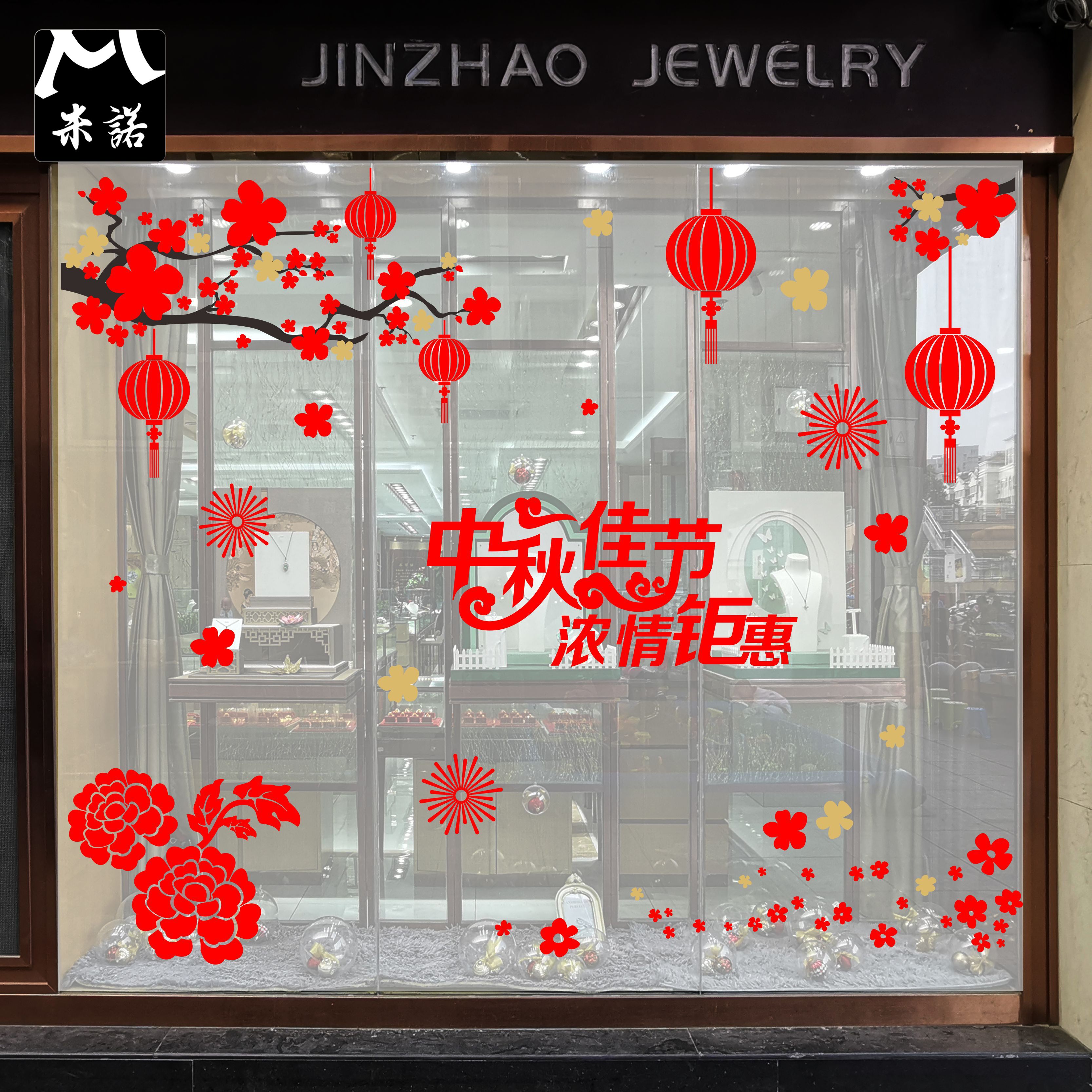 📚 中秋佳节喜迎国庆黄金首饰男装鞋包店铺梅花灯笼大橱窗玻璃墙贴纸