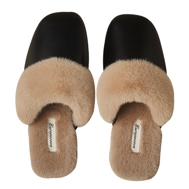 📚 黑色女款皮棉拖鞋冬季加绒保暖防滑室内居家用防水pu拖鞋女士冬天