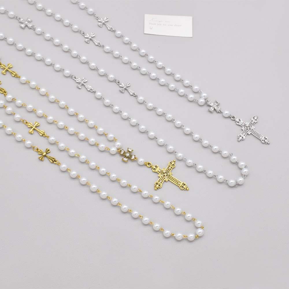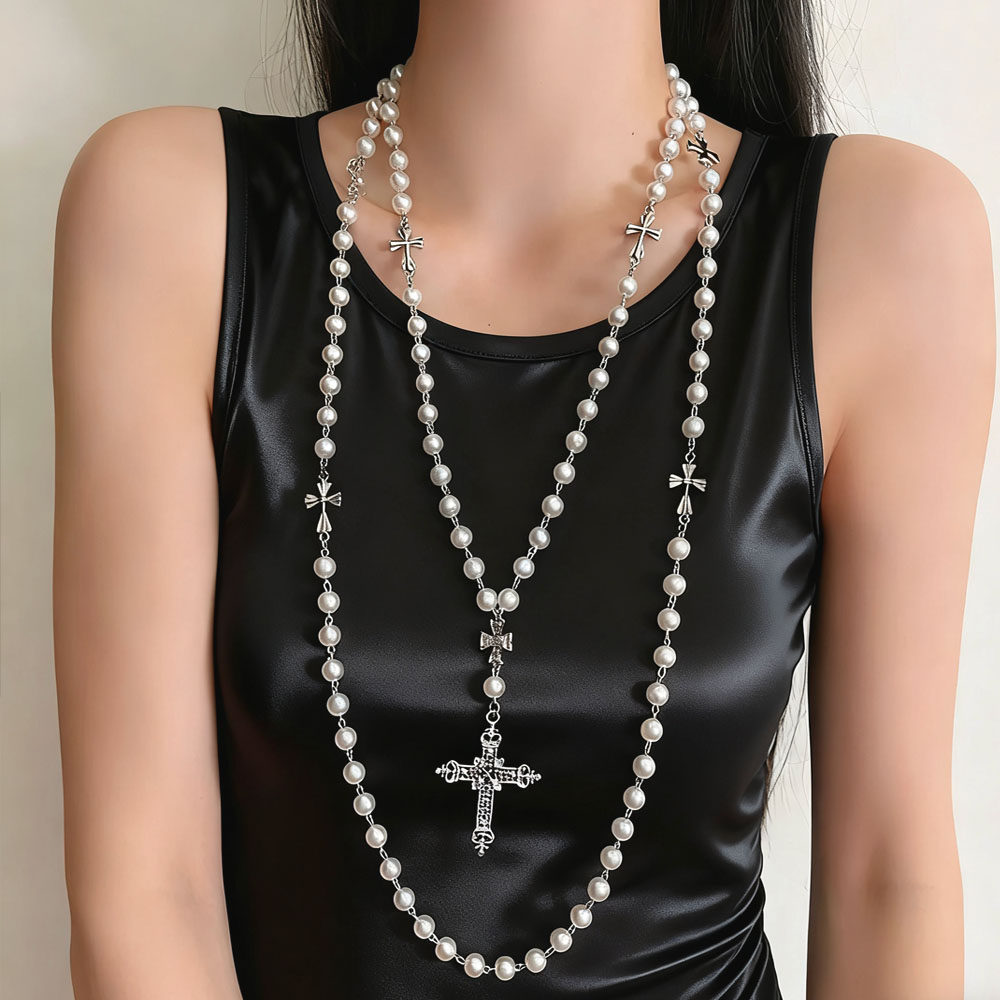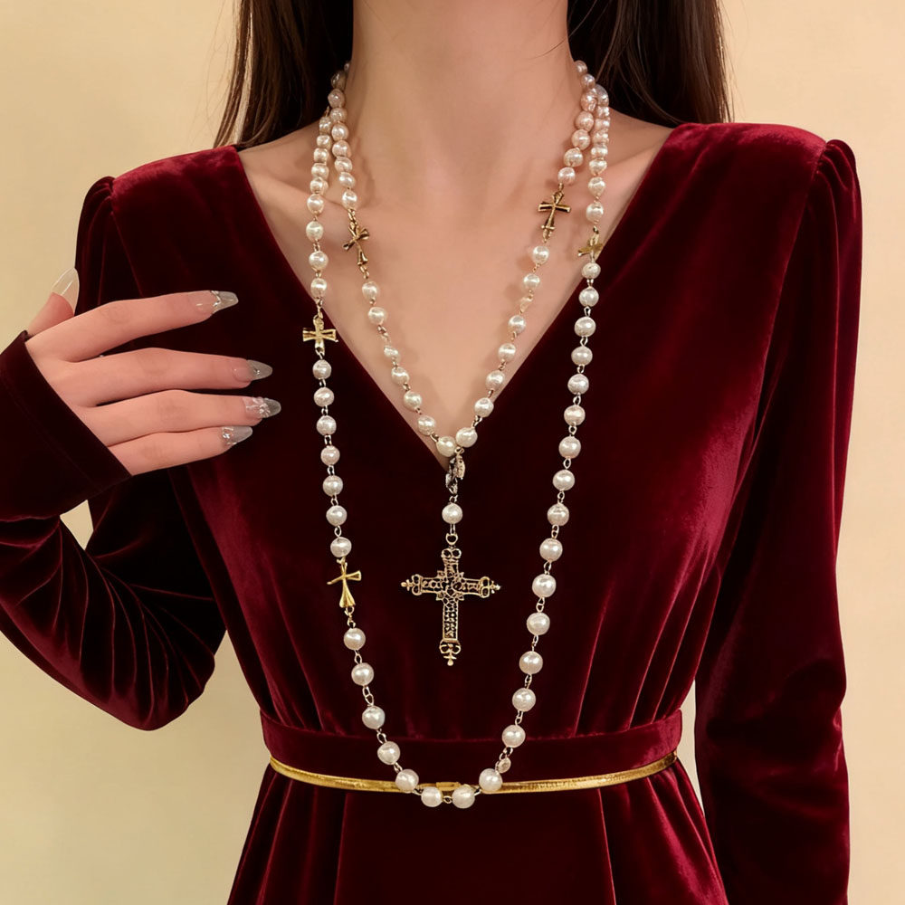 📚 秋冬双层叠戴十字架珍珠项链女轻奢长款串珠设计百搭毛衣链颈链潮