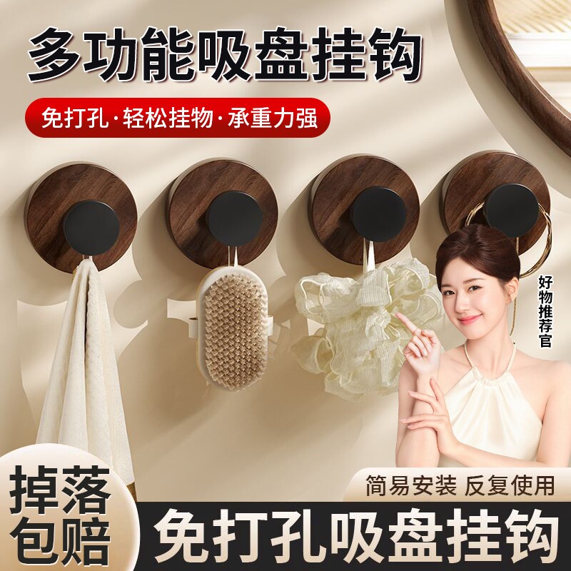 📚 胡桃木纹吸盘旋钮挂钩厨房旋转壁挂式置物架免打孔收纳架挂架承重