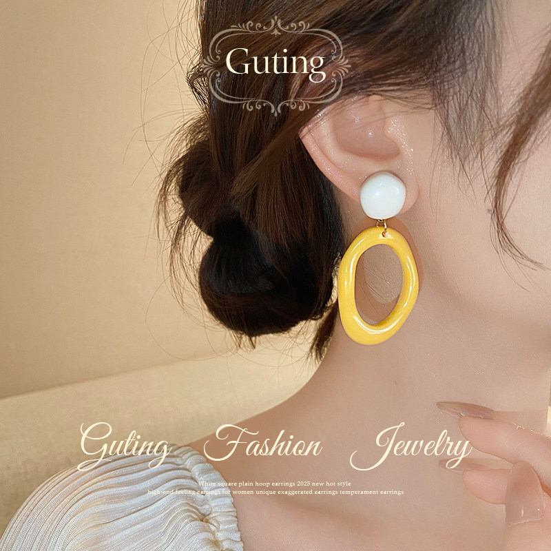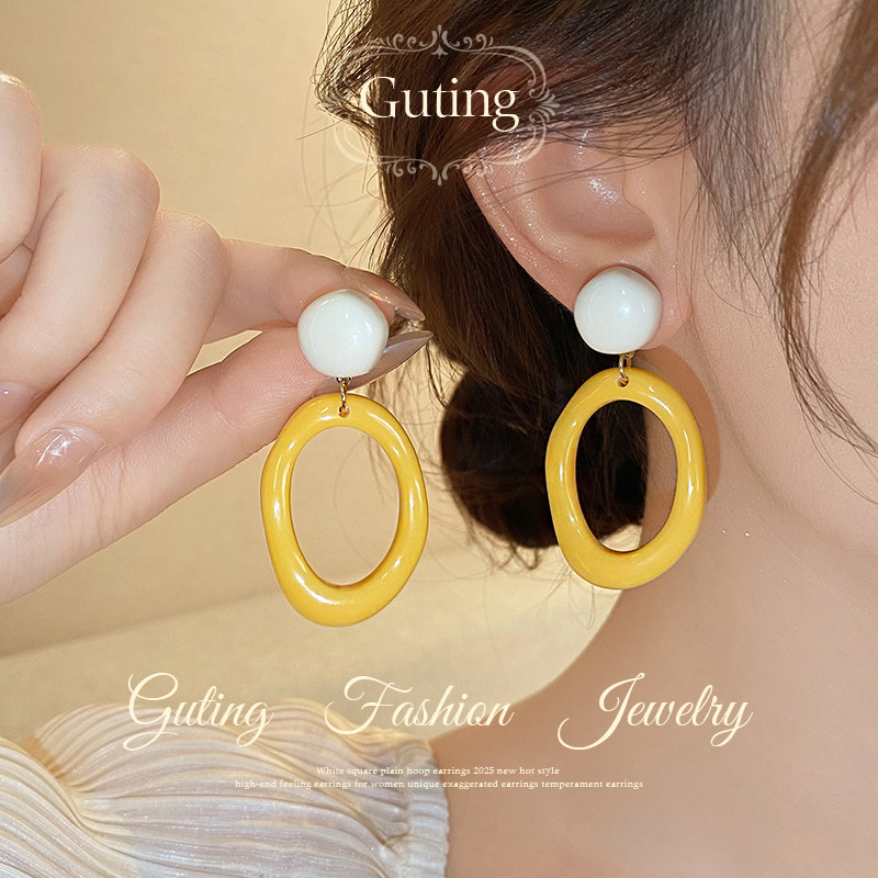 📚 古婷黄色几何耳环女小众设计感方圆脸耳钉独特漂亮耳饰2026年新款