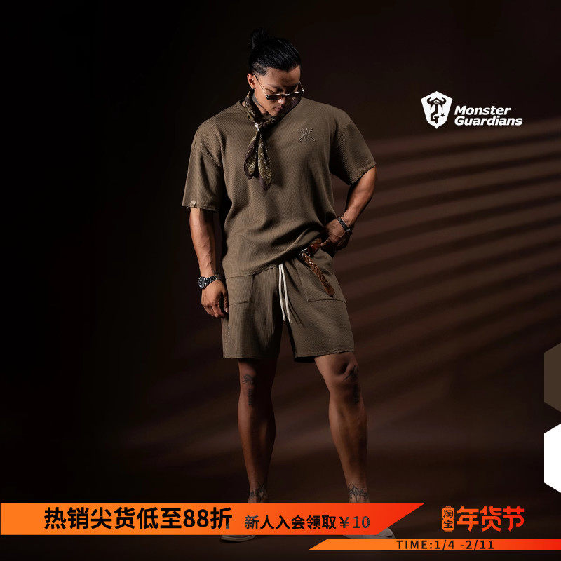 🔥解锁潮流新风尚!Monster Guardians N系列华夫格短宽落肩刺绣宽松休闲健身短袖男,券后价只需259💥