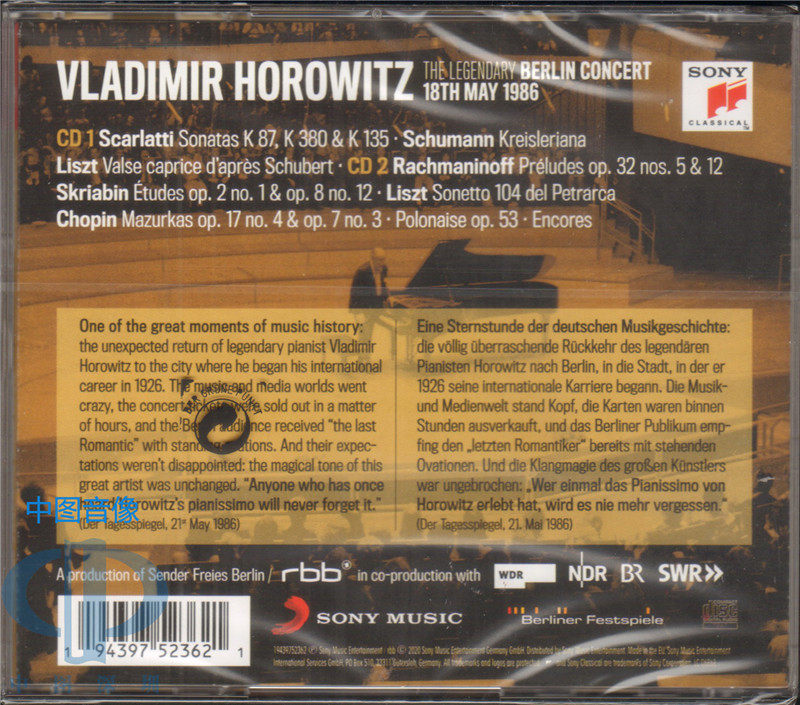 📚 【中图音像】 霍洛维茨 1986年柏林音乐会 2CD 19439752362 SONY