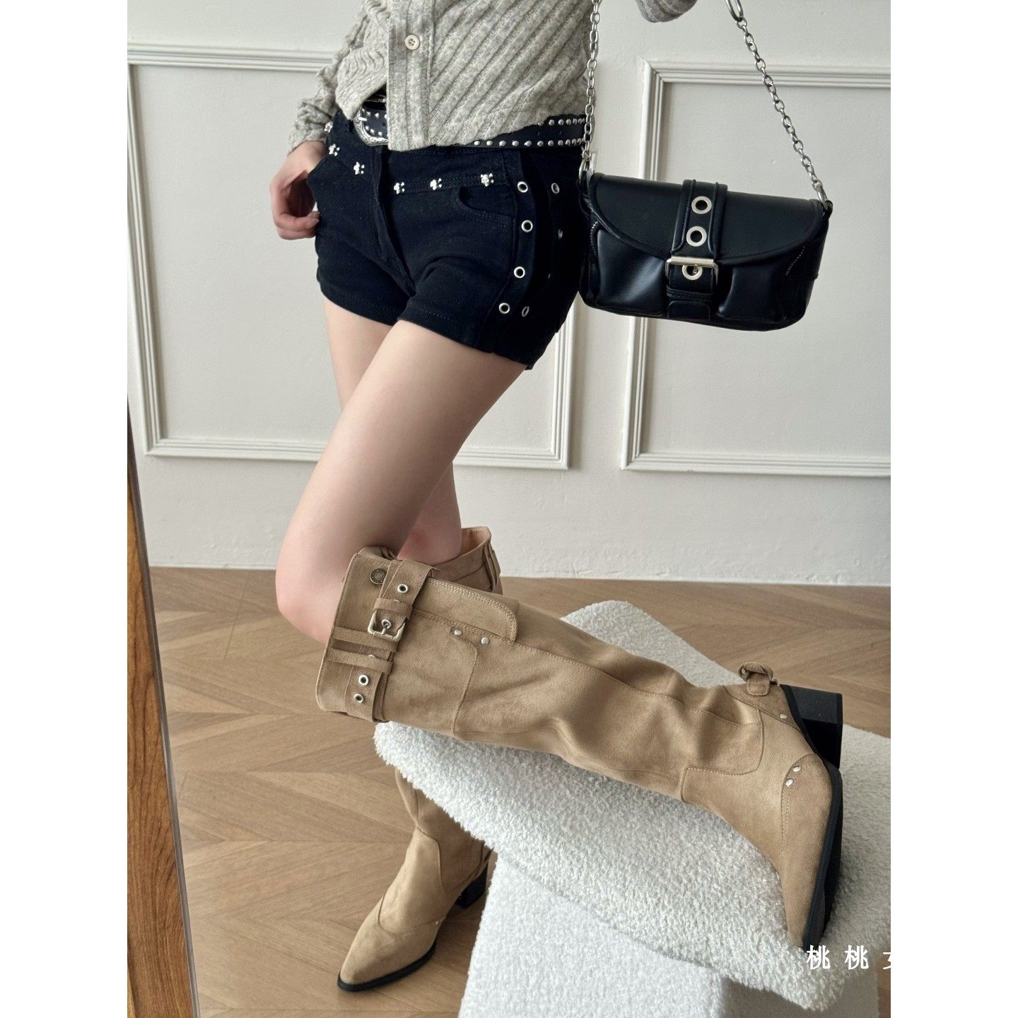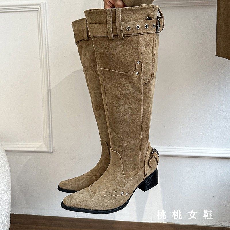 📚 大筒围堆堆靴尖头长筒裤管靴女2026春秋新款粗跟皮带扣炸街时装靴