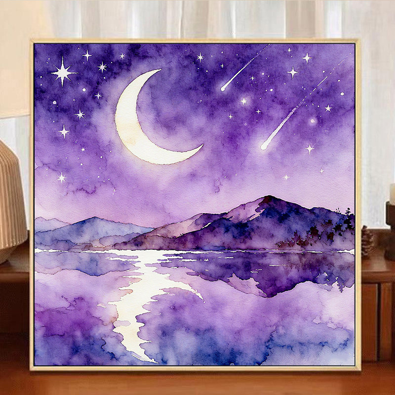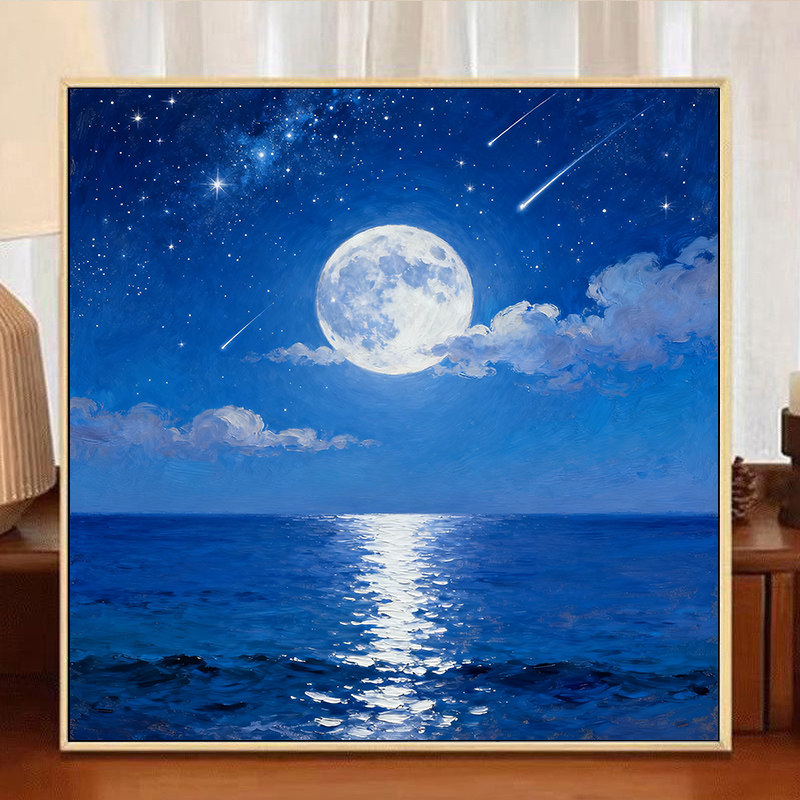 📚 璀璨星空 月牙月亮海景夜景倒影diy数字油画手绘填色油彩画装饰画