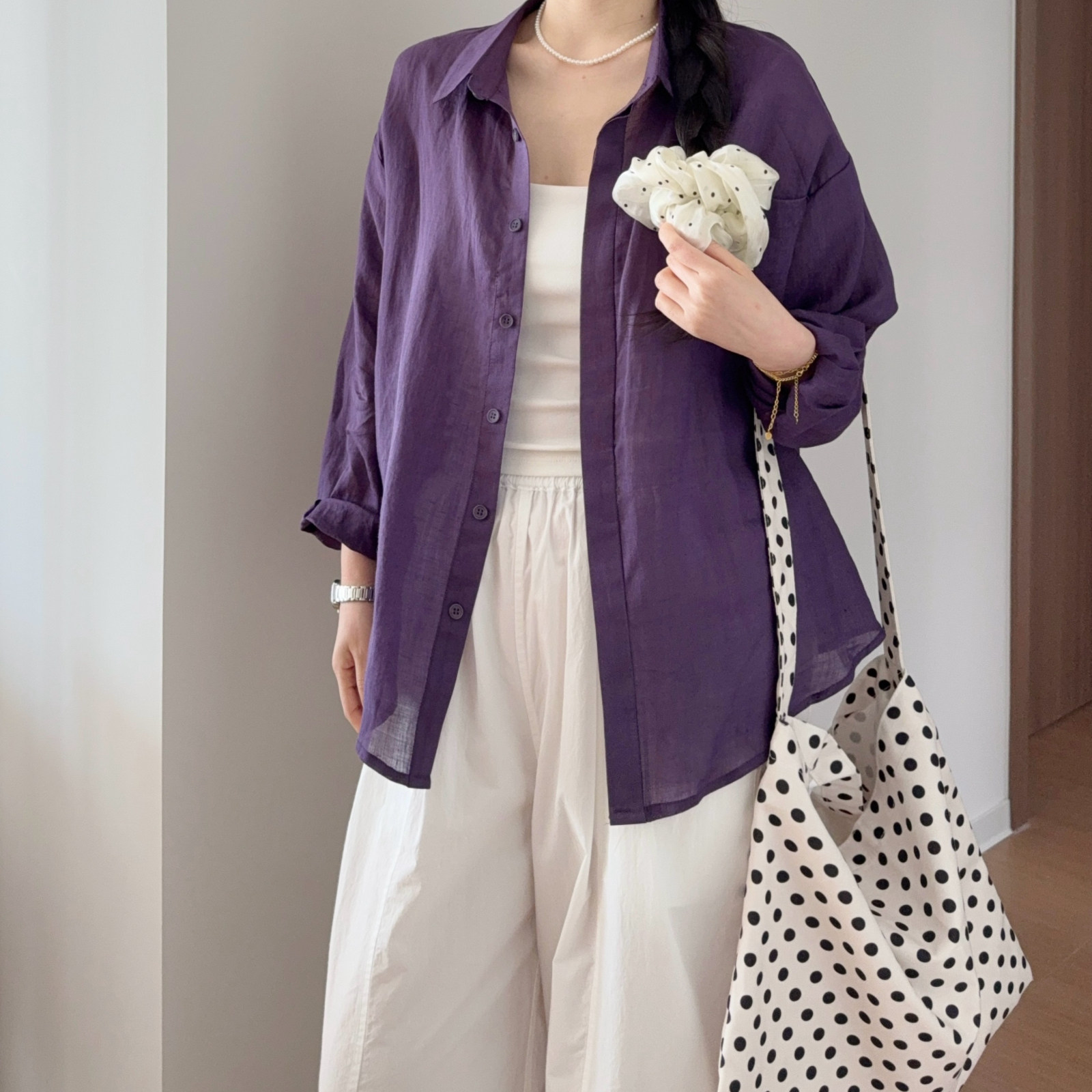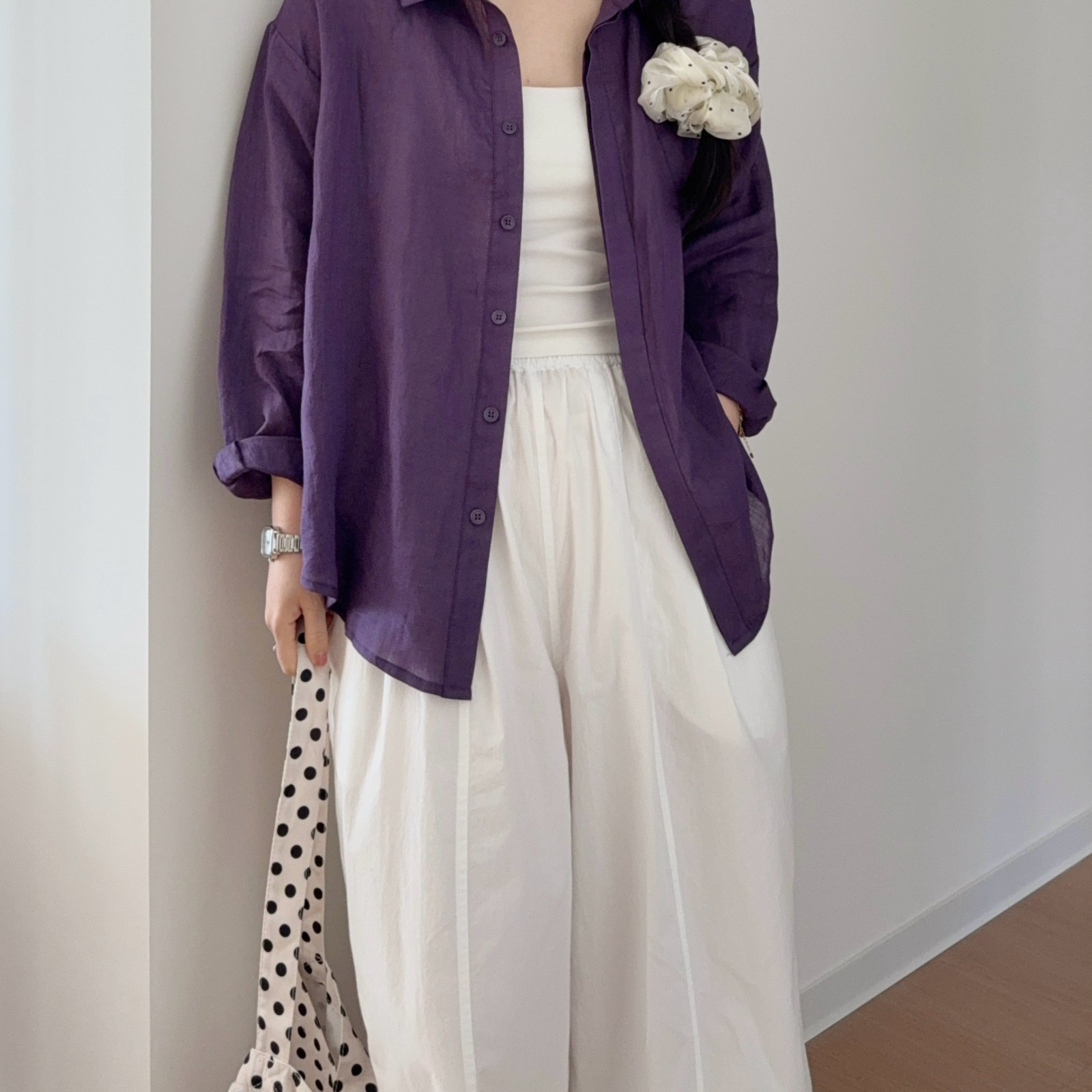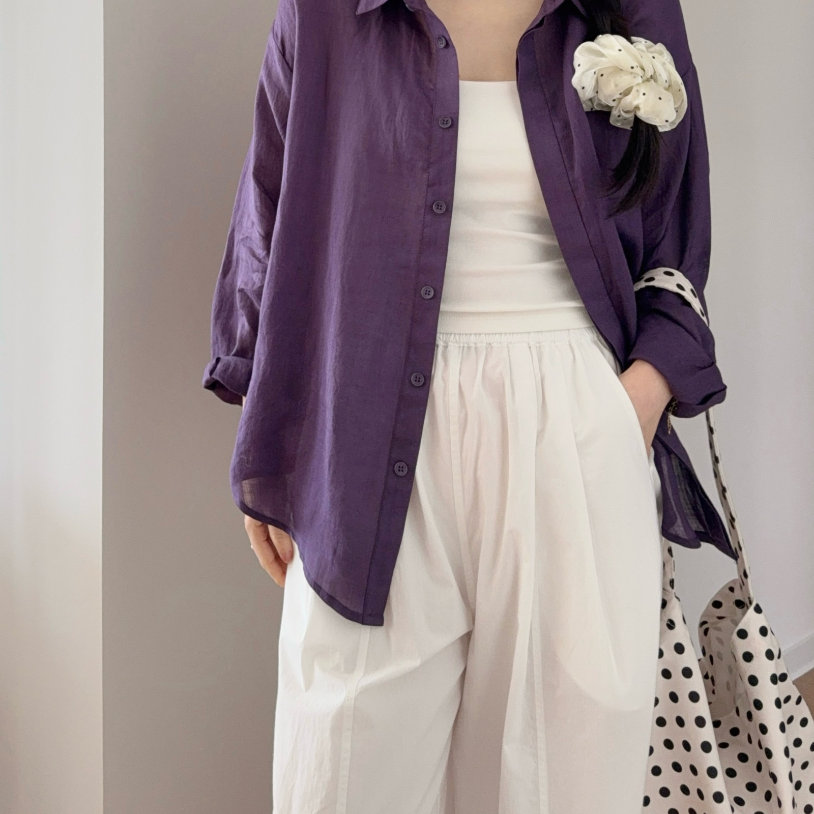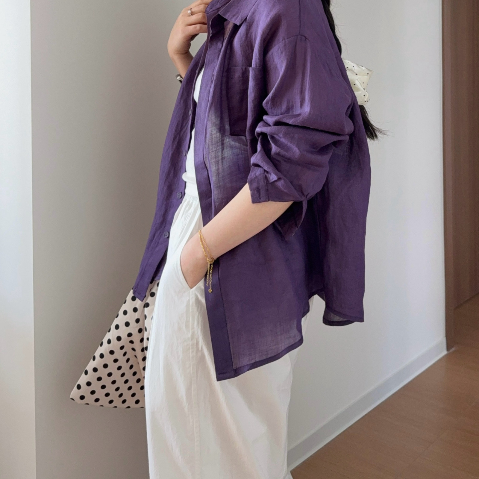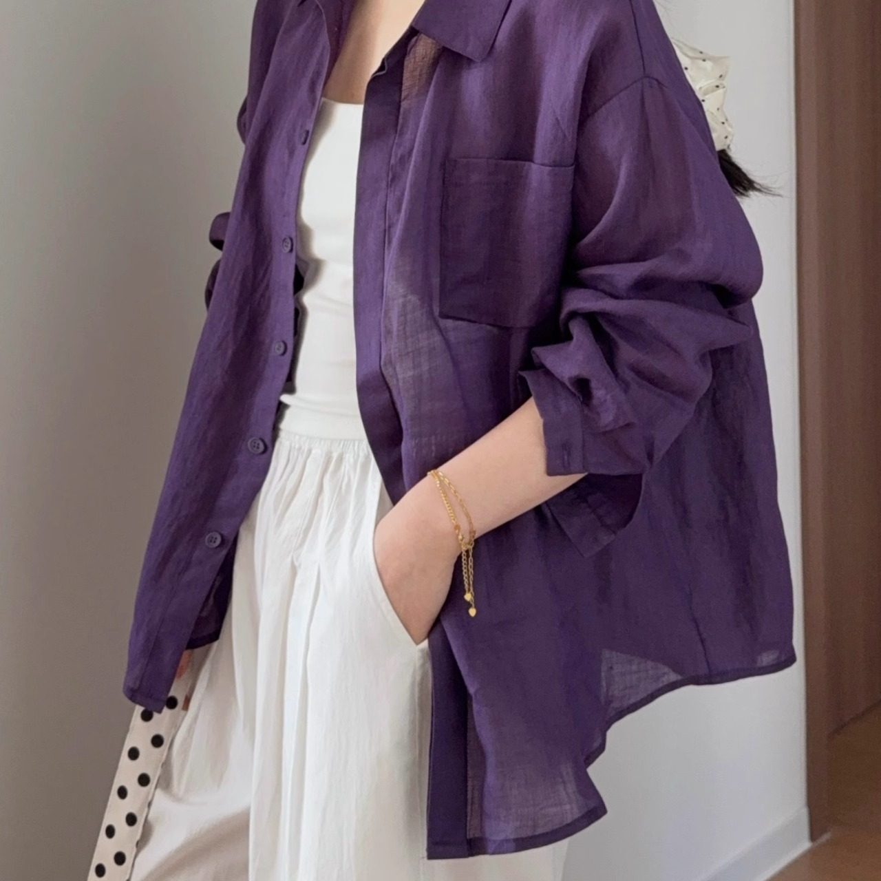 📚 显白深紫色。天然高支酵洗60支苎麻宽松衬衫女长袖2025夏独家自制