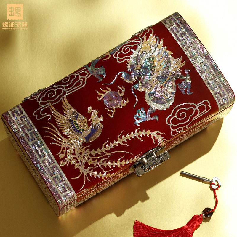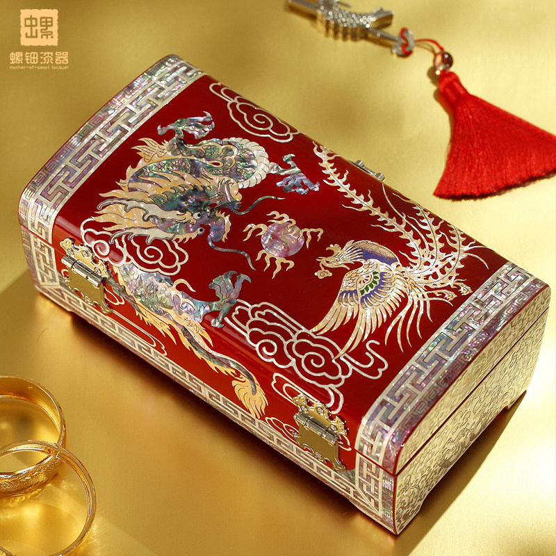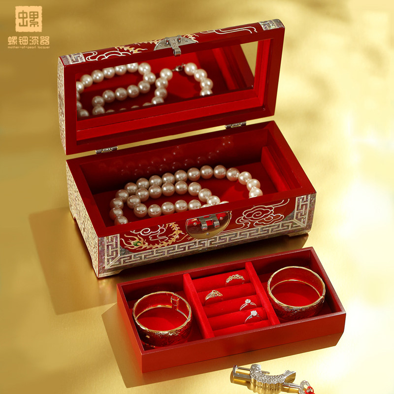 📚 螺钿漆器首饰盒带锁中国古风古木质三金饰品收纳盒子高档结婚礼物