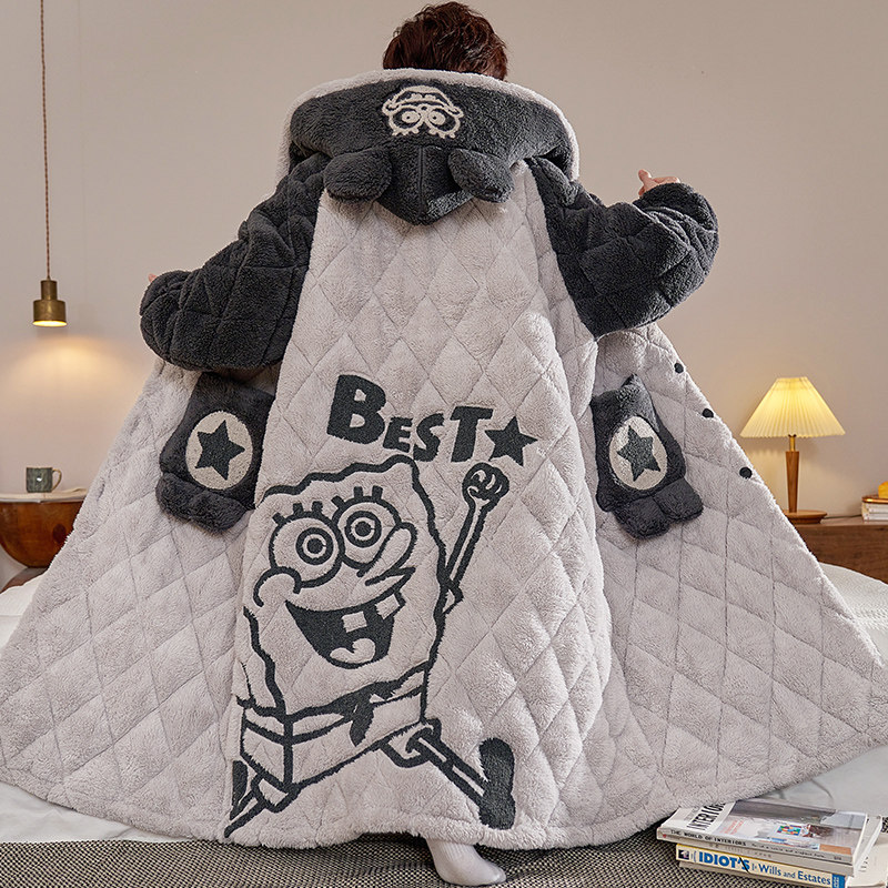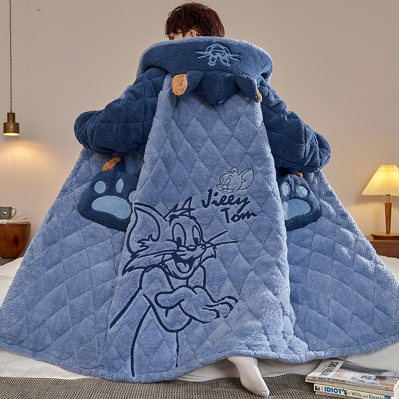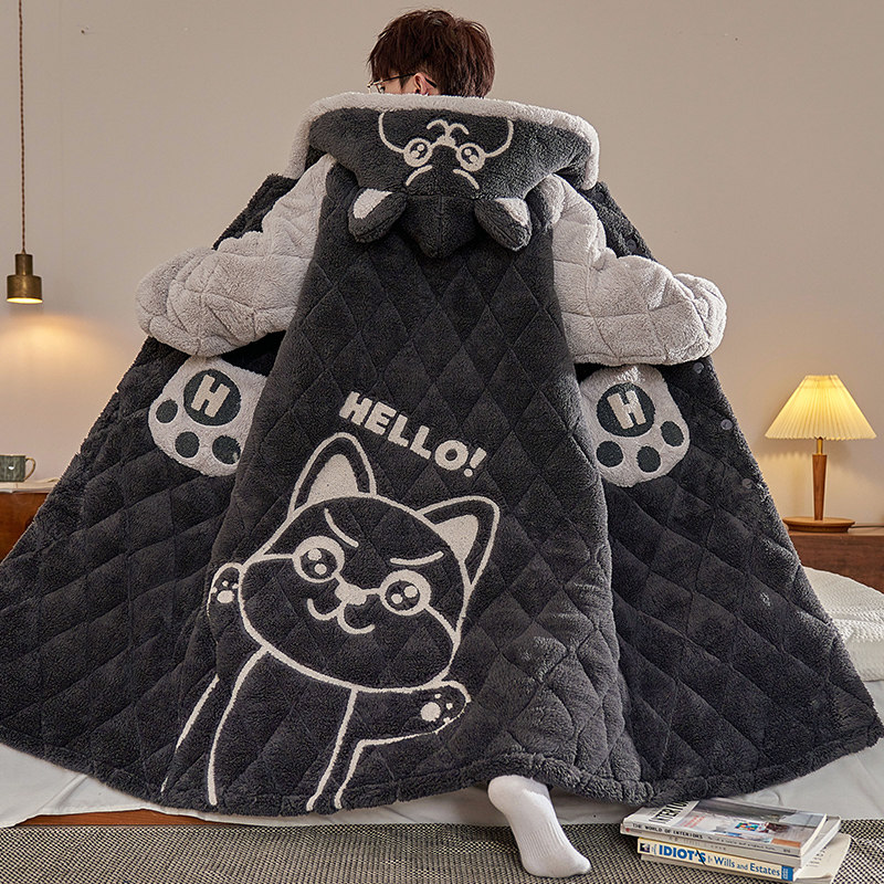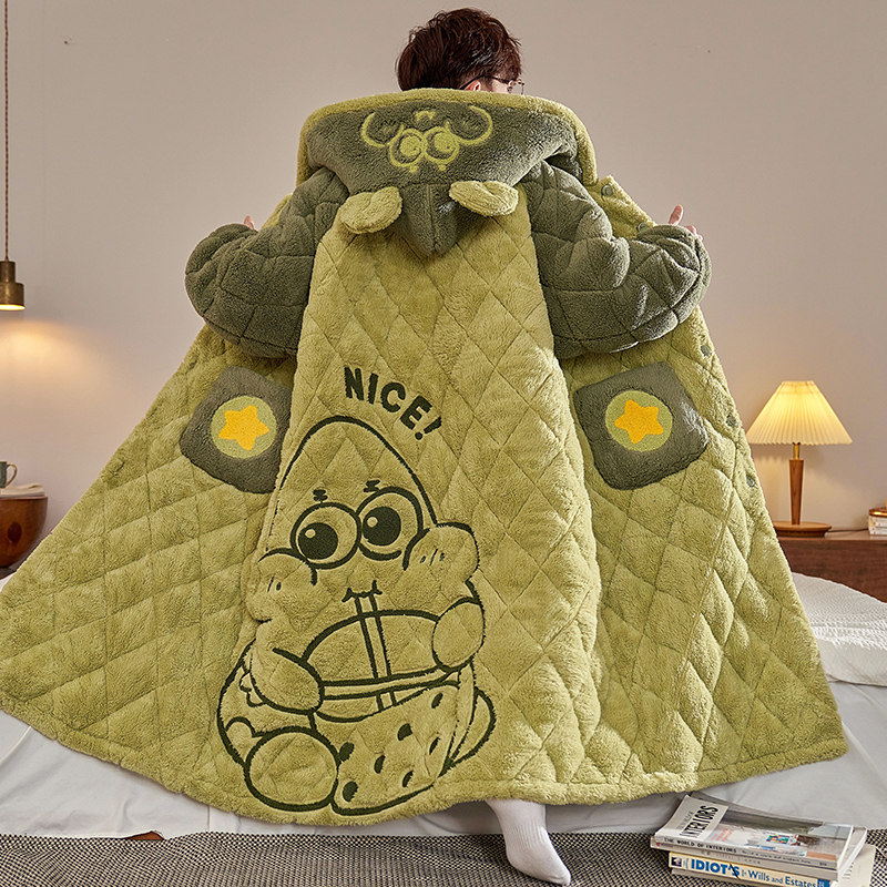 📚 珊瑚绒睡衣男士冬季加厚加绒大码三层夹棉袄睡袍可爱保暖长款套装