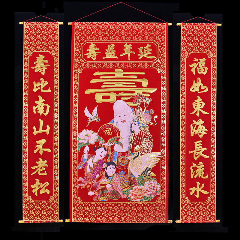 📚 爷爷奶奶老人生日祝寿对联绒布寿字客厅中堂画寿星图对联挂画寿联