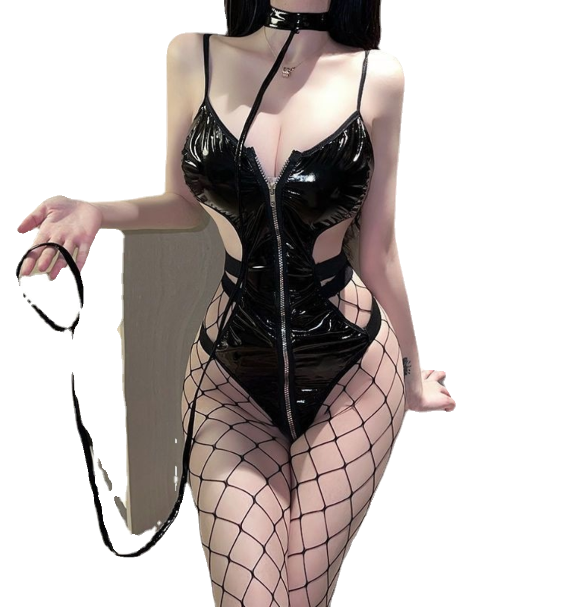 📚 「西野暮色」 连体漆皮吊带拉链小胸显大镂空PU颈环吊脖睡裙