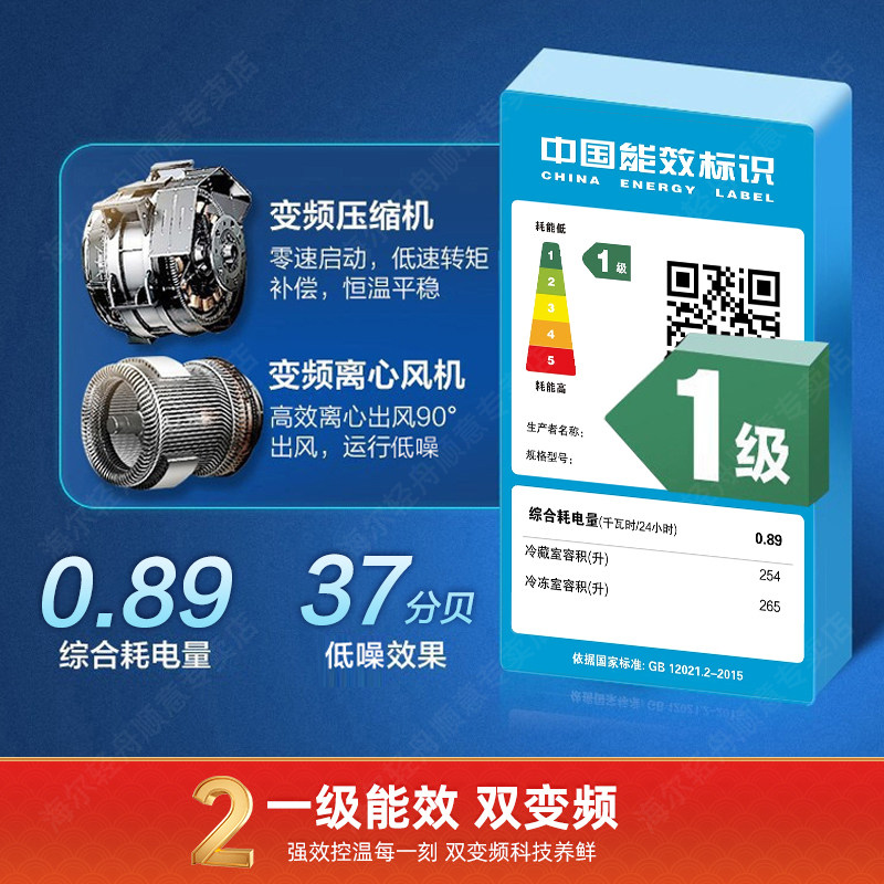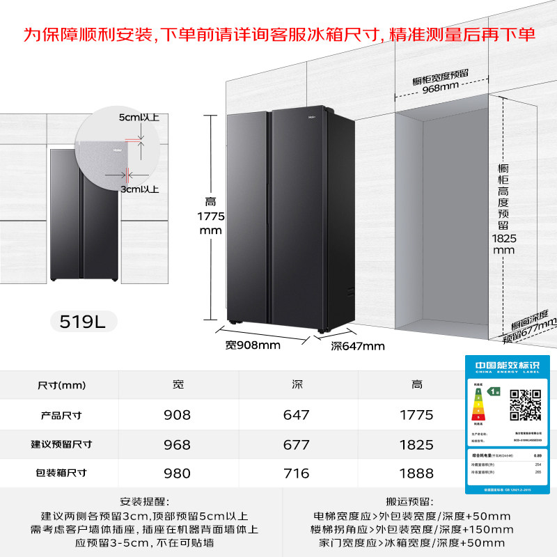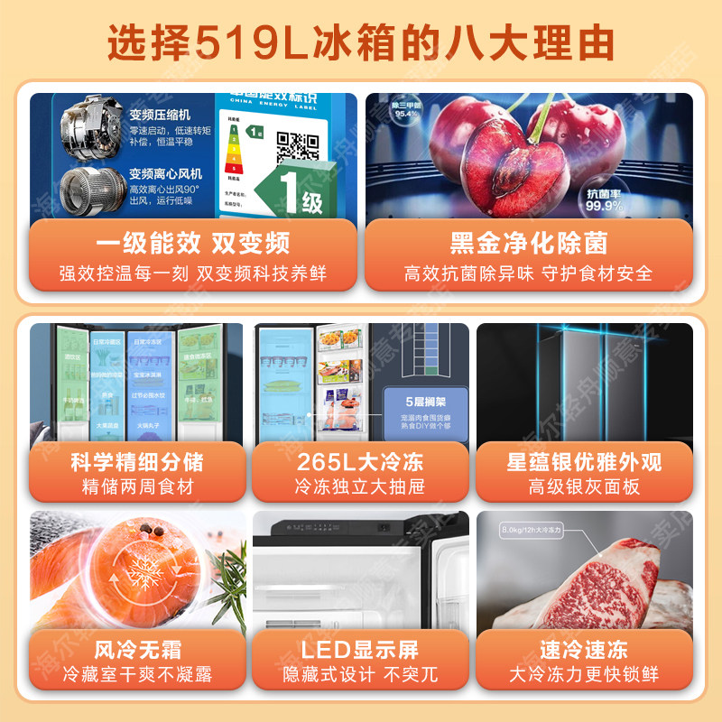 📚 海尔519升对开门大冷冻黑金净化一级变频双开门大容量家用电冰箱