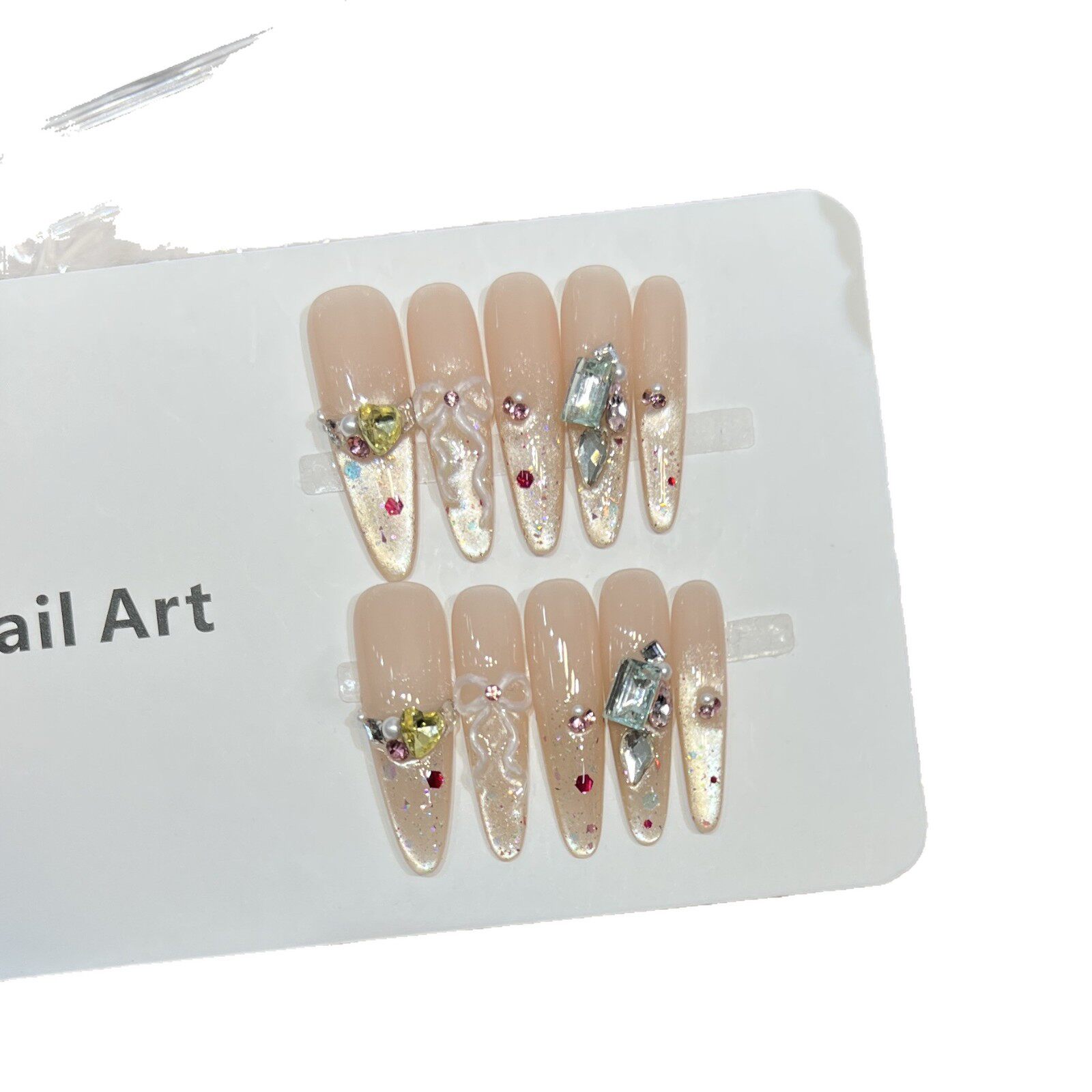 📚 纯手工穿戴甲2026年新款【佛罗浪漫】甜美猫眼法式亮片蝴蝶结美甲