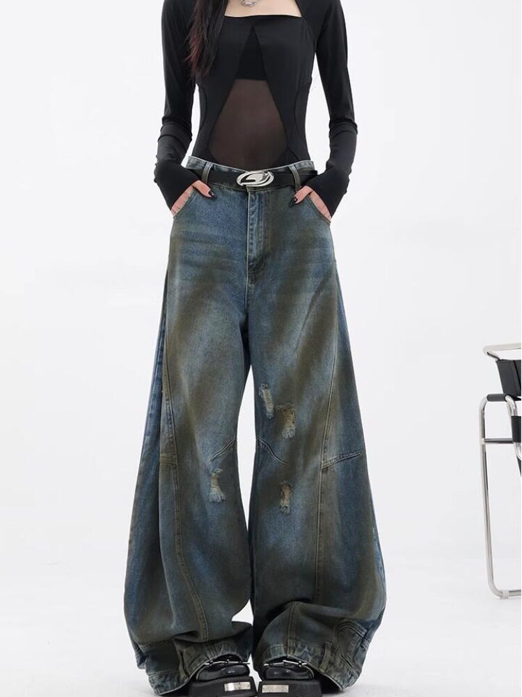📚 KNEH美式复古水洗直筒破洞倒装牛仔裤女设计感宽松阔腿脏脏裤裤子