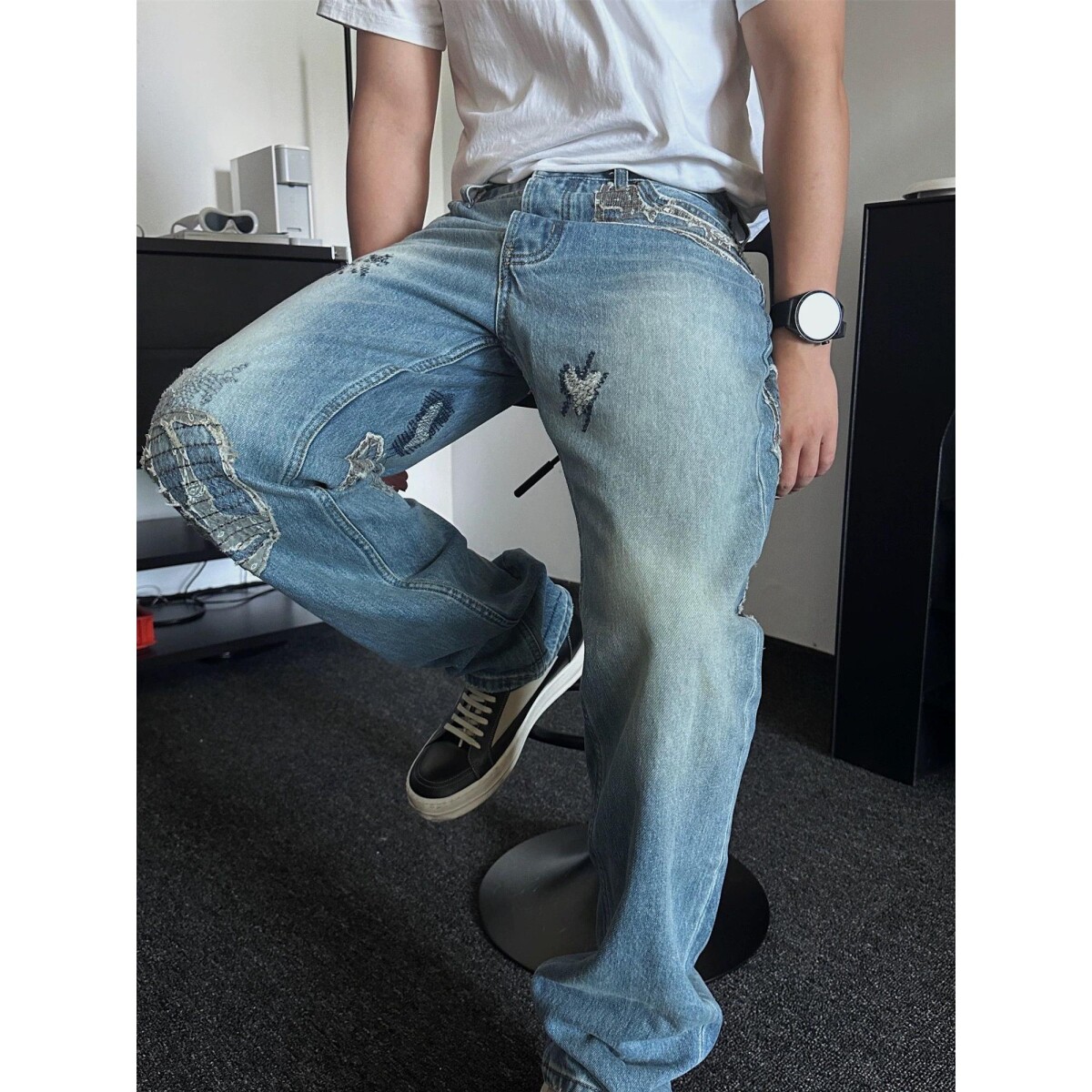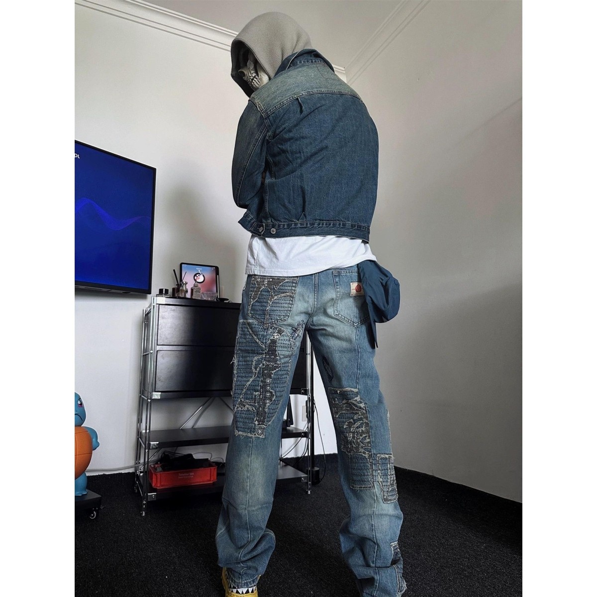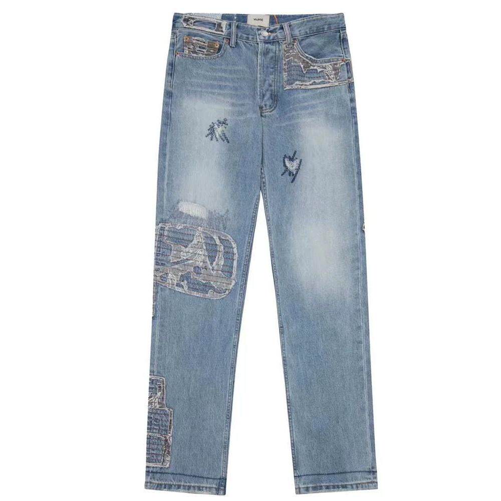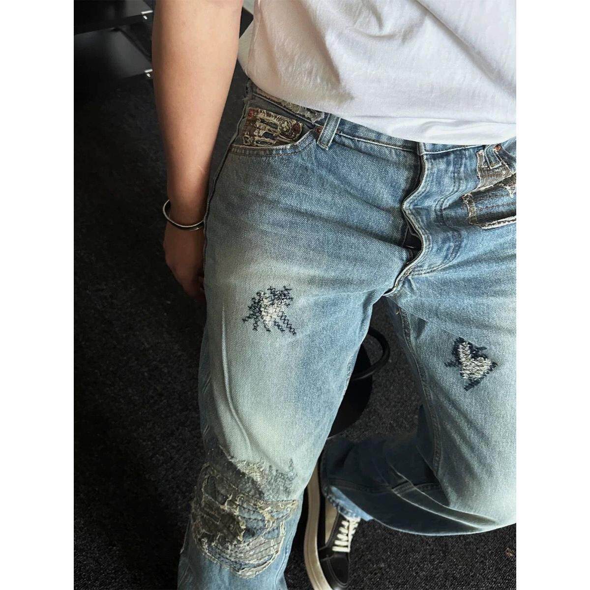 📚 红星古布拼接水洗牛仔裤vujade重工刺绣直筒长裤ken同款做旧boro