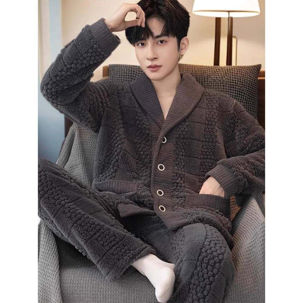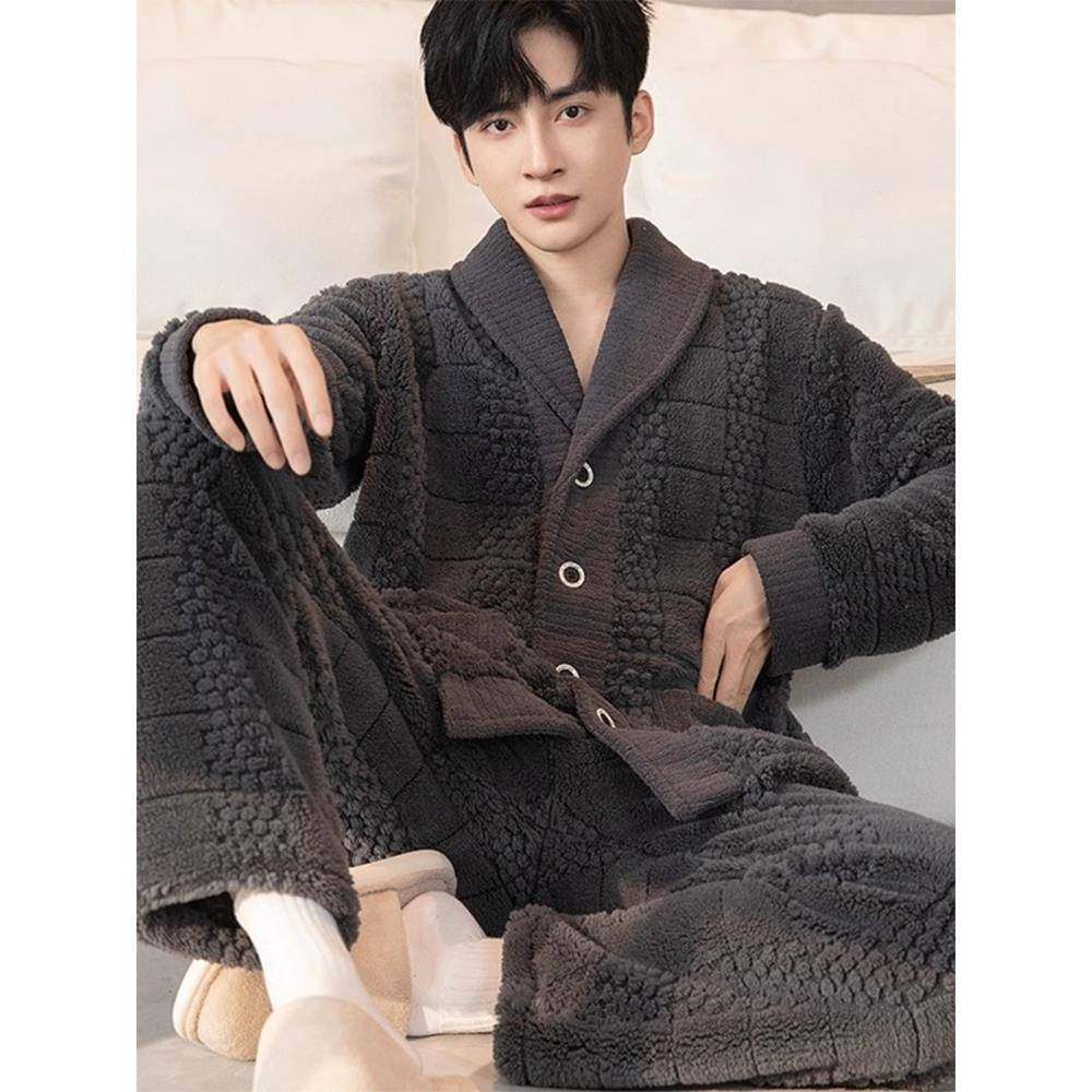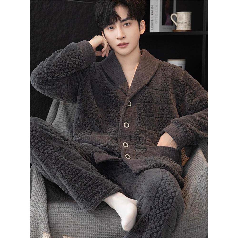 📚 秋冬男士珊瑚绒睡衣加绒加厚保暖法蓝绒格子提花翻领家居服1114z