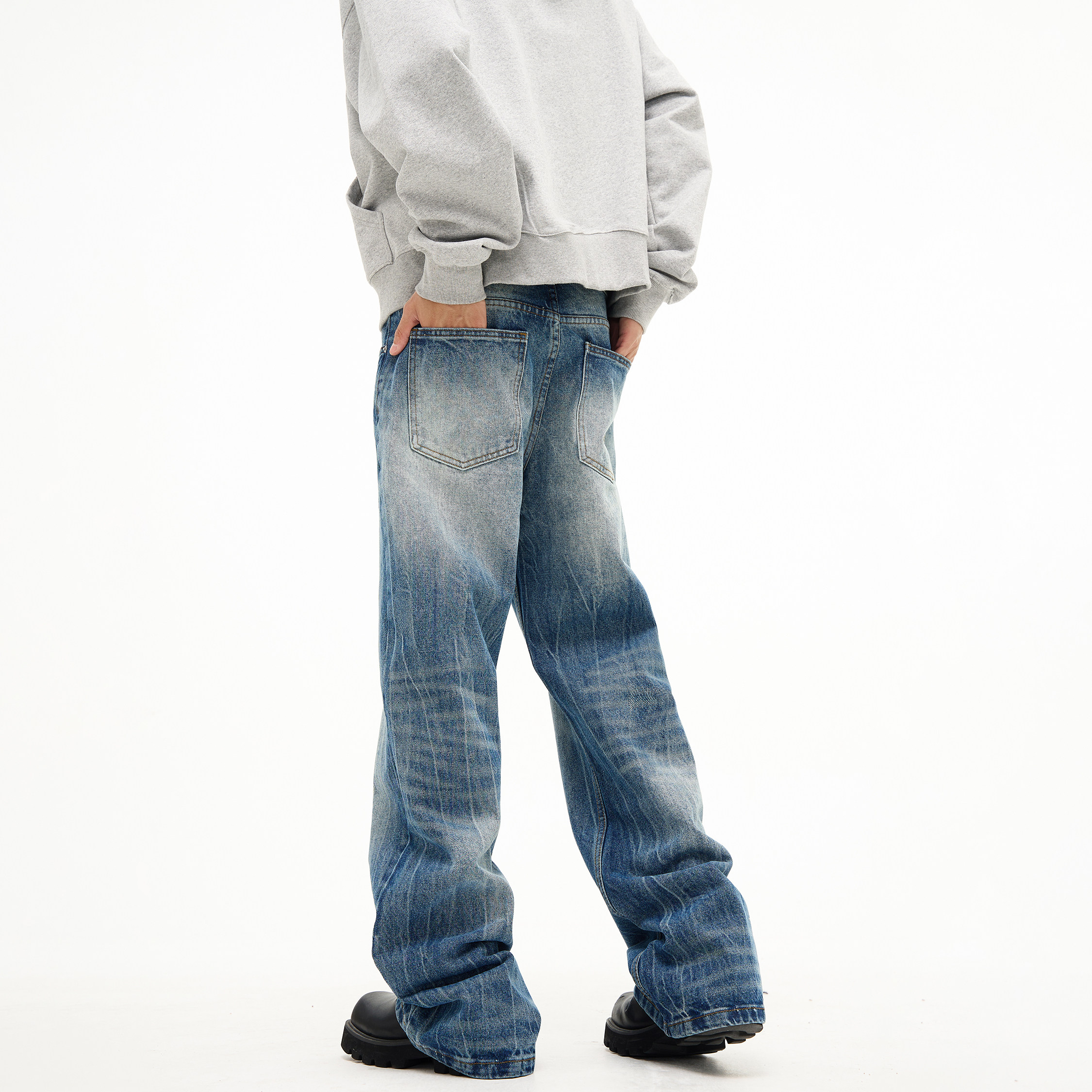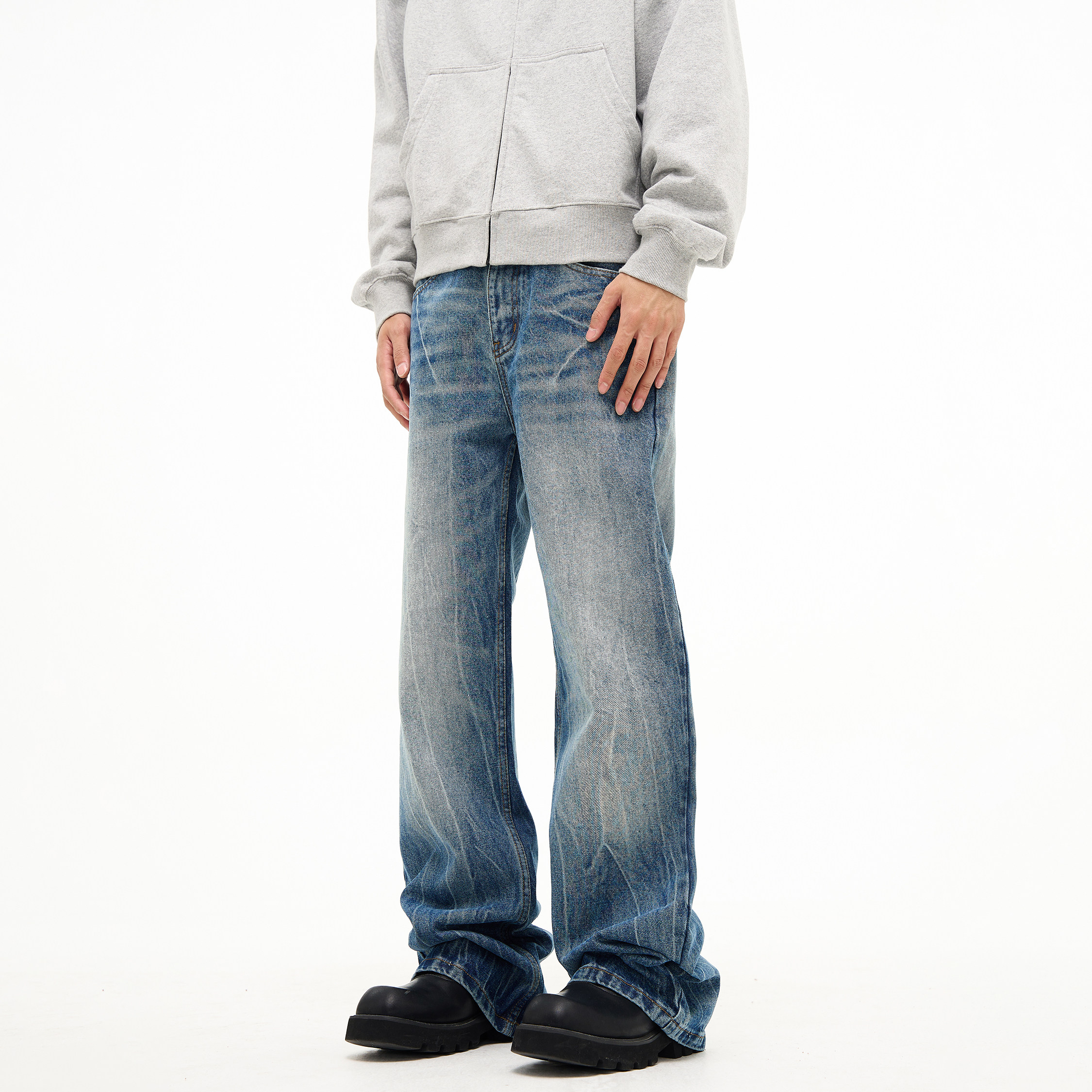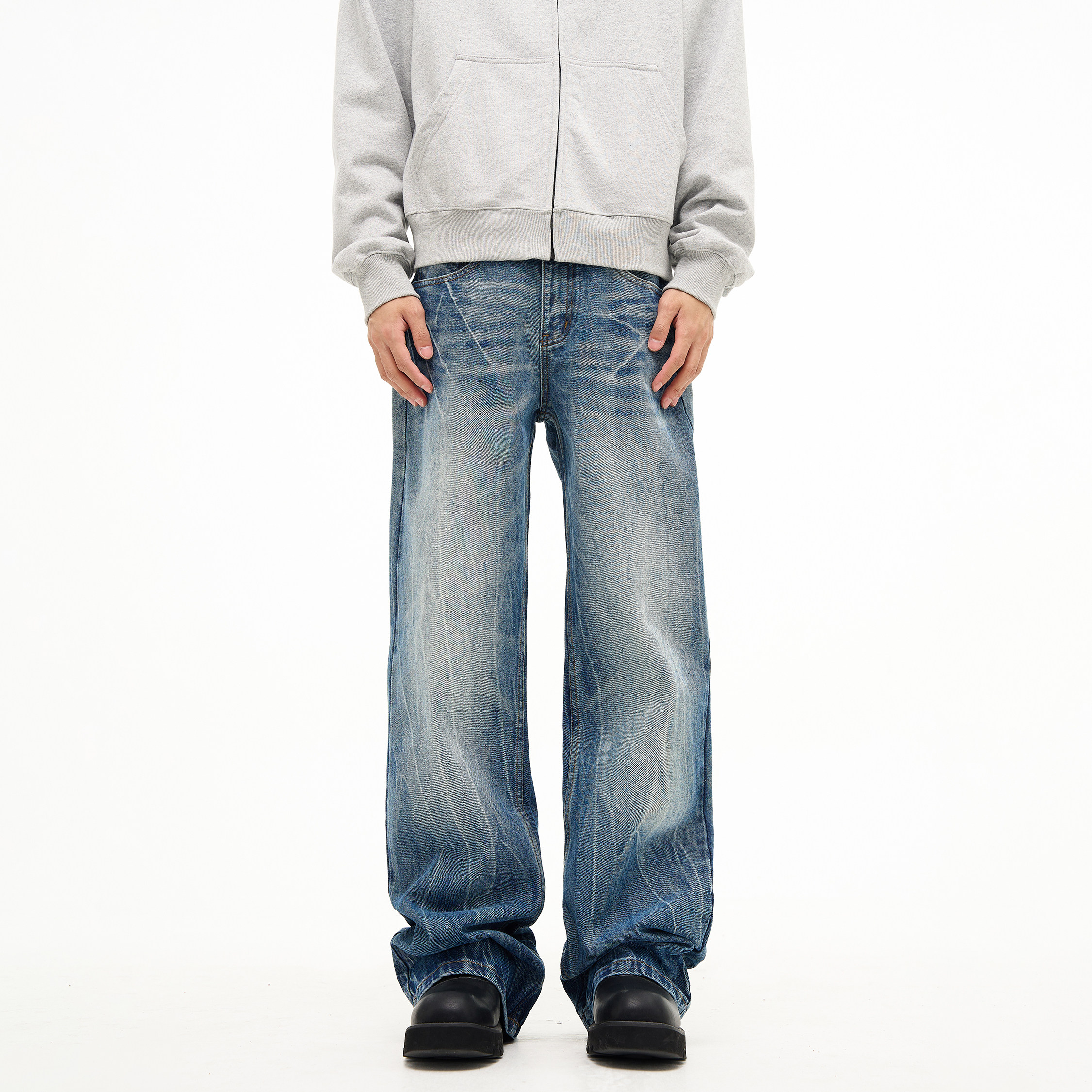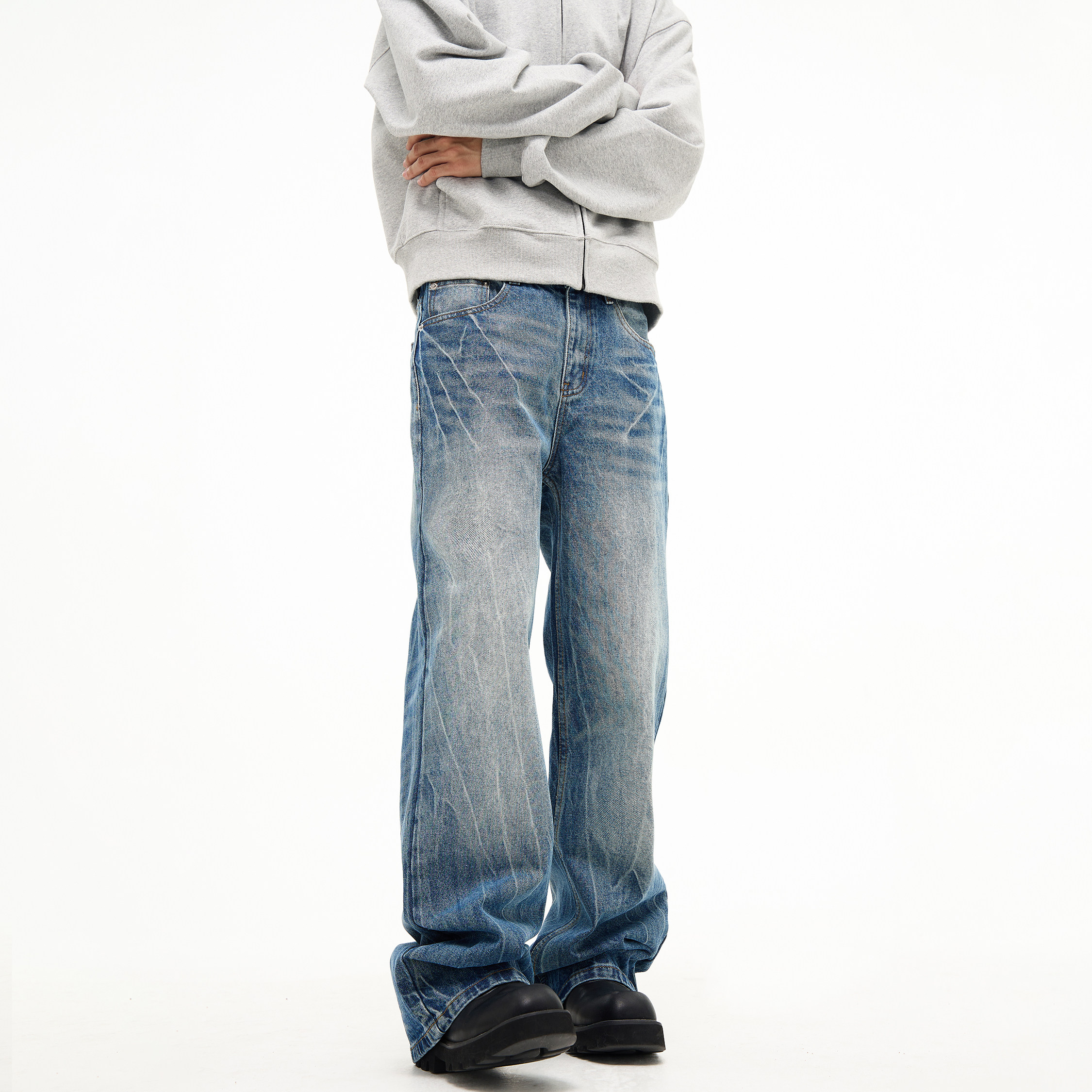 📚 FLYOFF新款潮流设计感闪电裂纹水洗牛仔裤美式复古直筒微喇裤子男