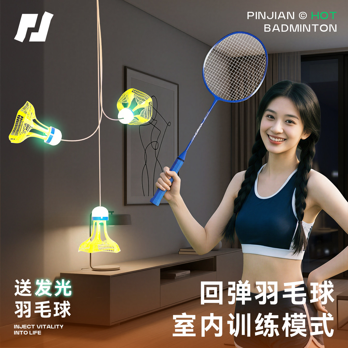 📚 品健遥控羽毛球单人训练器回弹自打室内运动空中悬挂在家练习神器