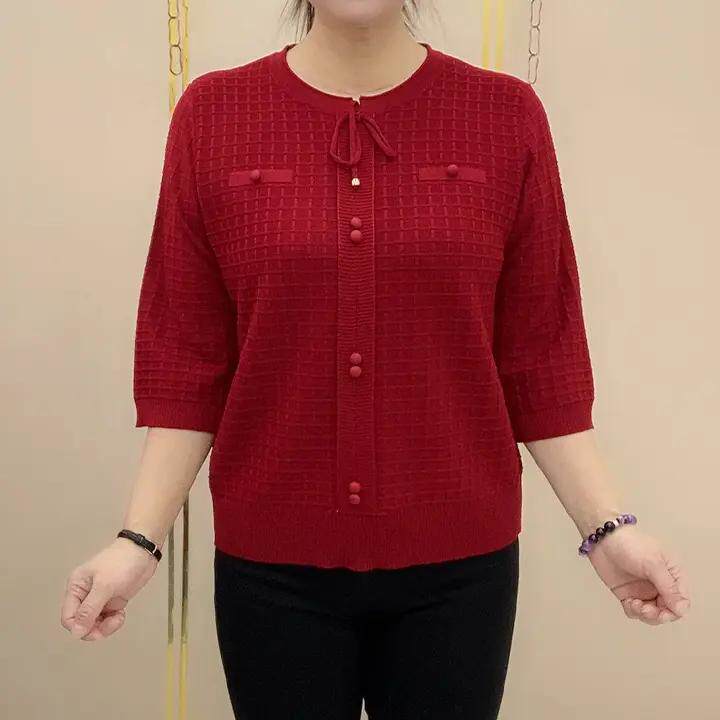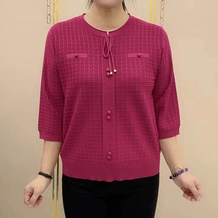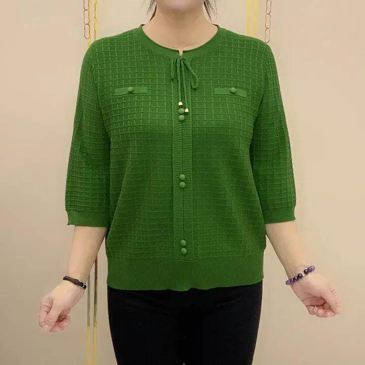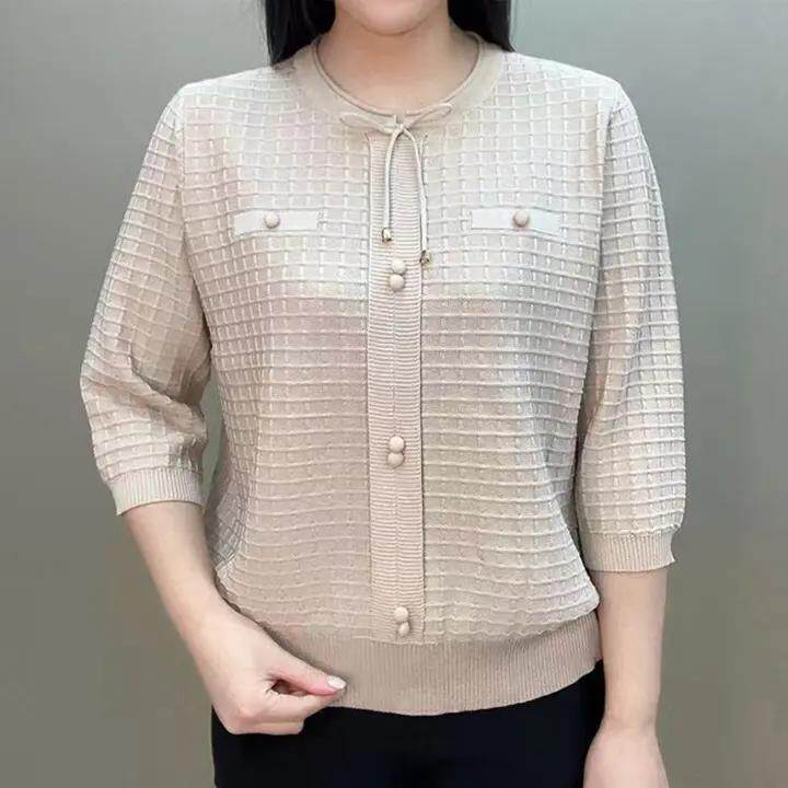 📚 2025春季新款休闲纯色百搭圆领七分袖针织衫女上衣绑带显瘦打底衫