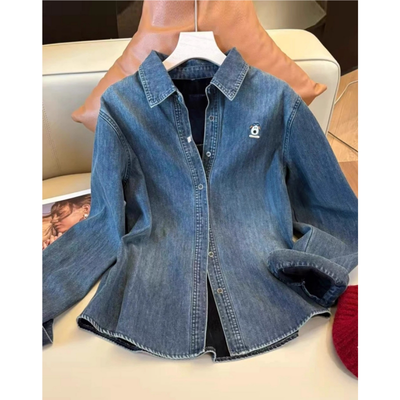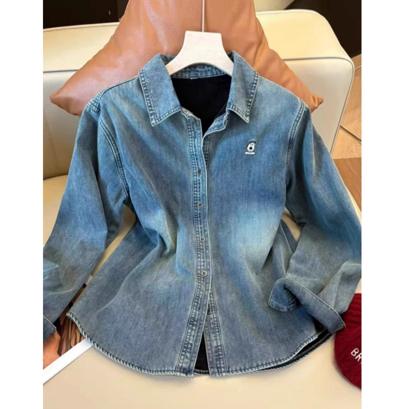 📚 蓝色叠穿翻领加绒牛仔衬衫女2025冬季设计感时尚气质内搭显瘦衬衣