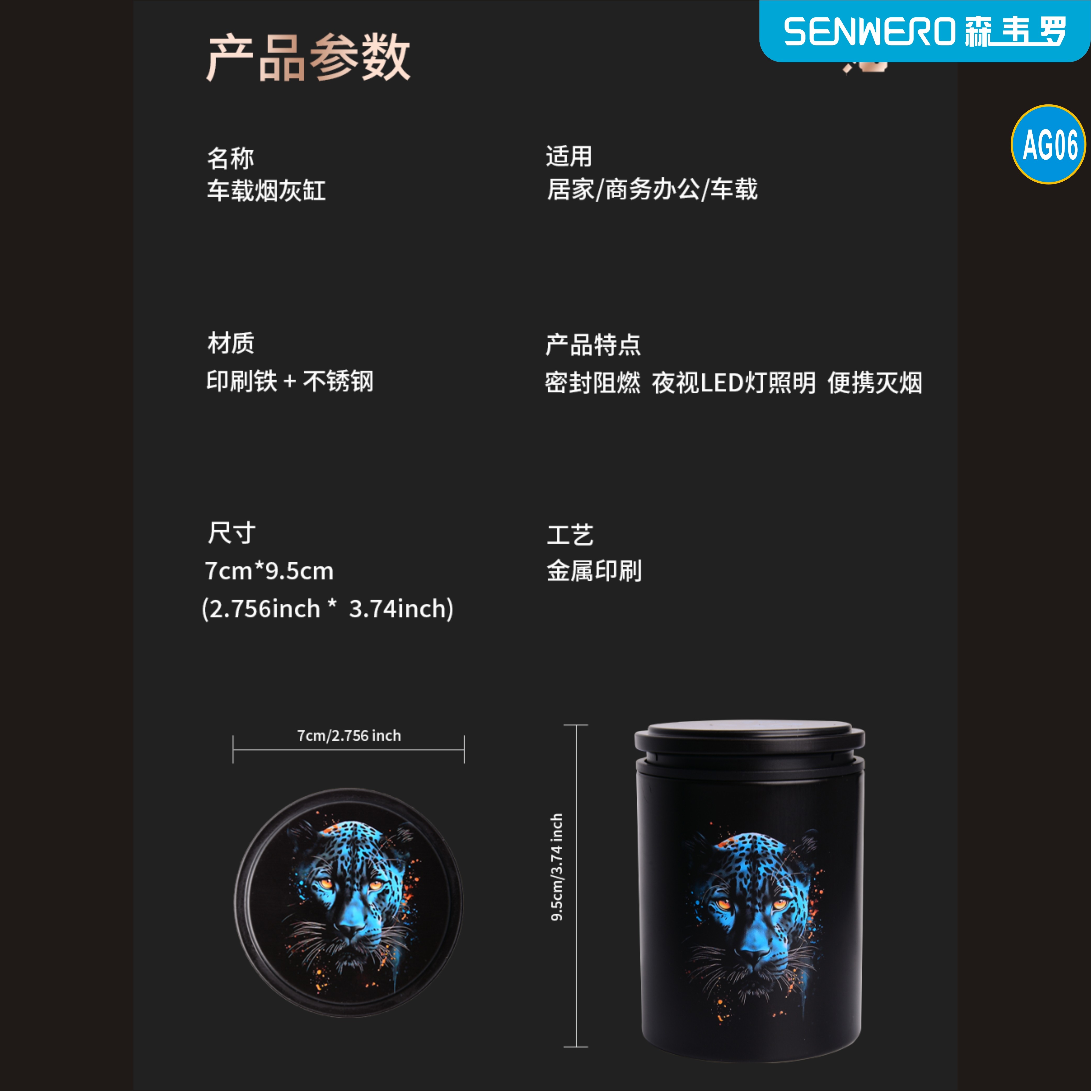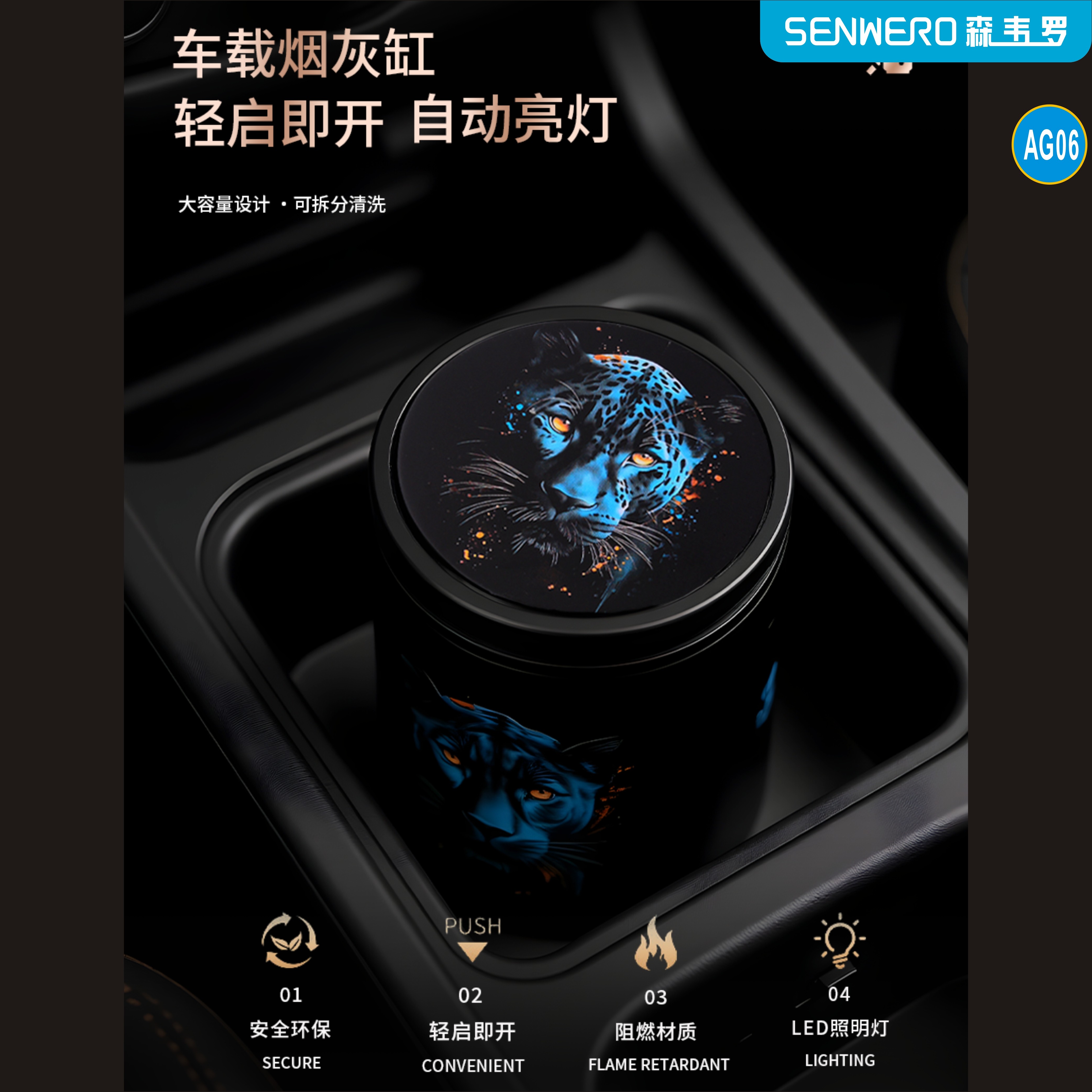 📚 新款车载烟灰缸防灰飞带LED灯可爱卡通图案漏斗形金属灭烟筒