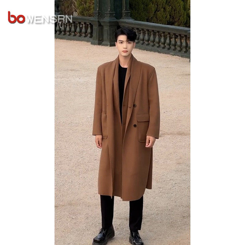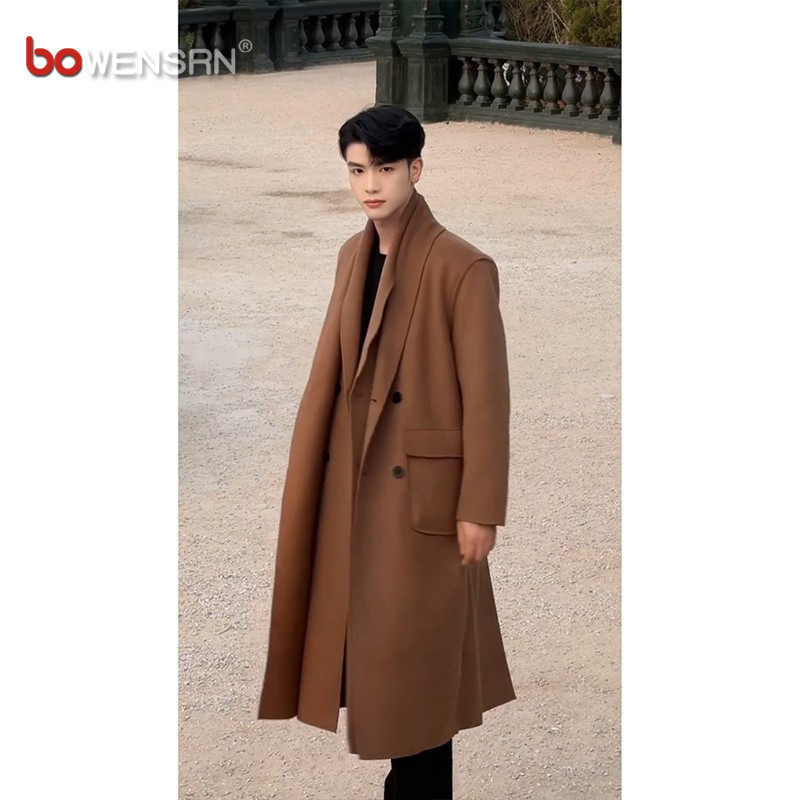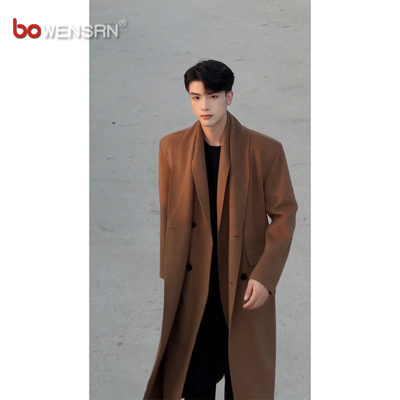 📚 美拉德双层领毛呢大衣男士2025新款冬装中长款假两件风衣外套男款