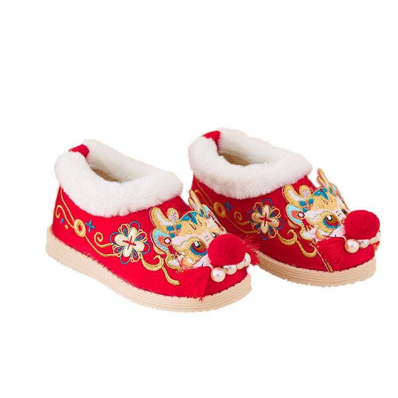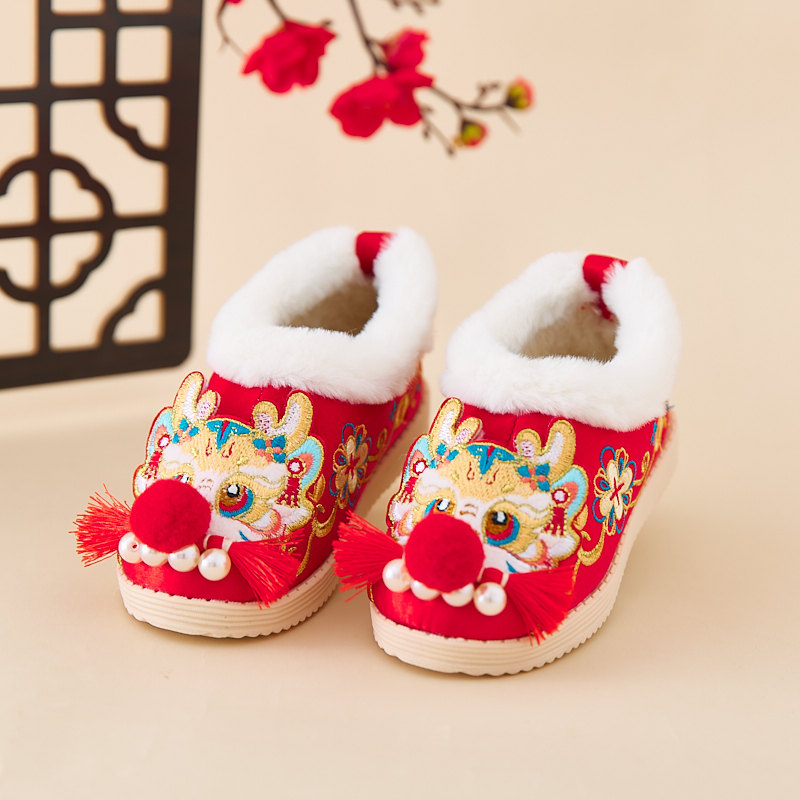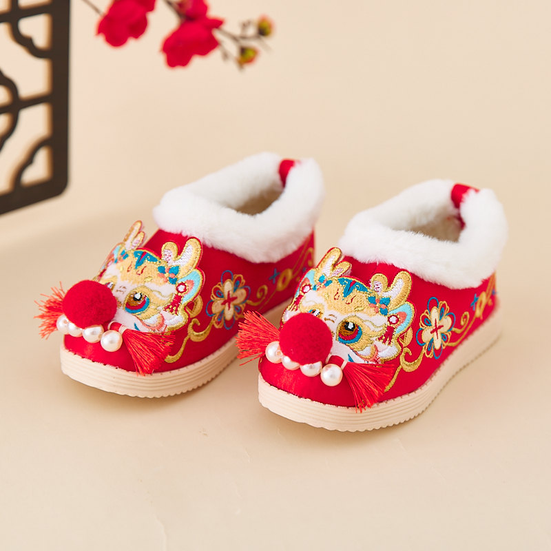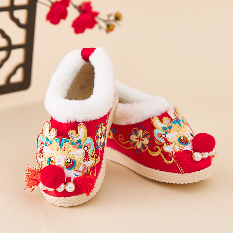 📚 汉服女童冬季新年虎头鞋儿童古风绣花布鞋宝宝过年红色喜庆棉鞋