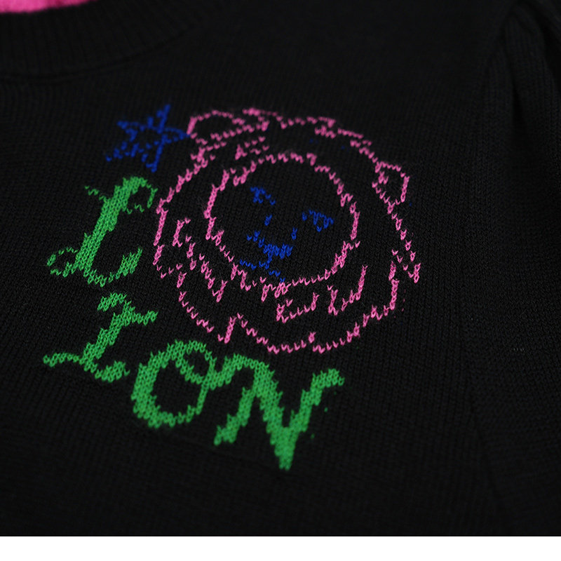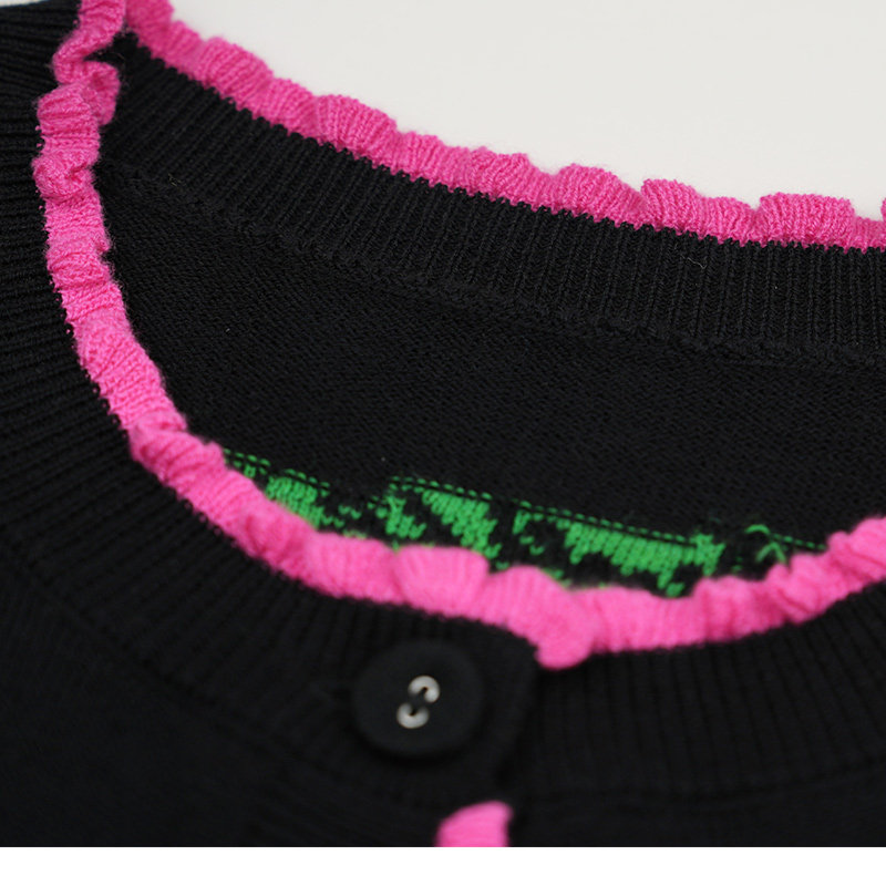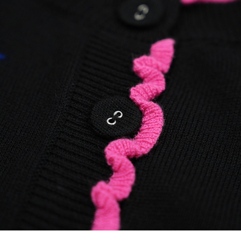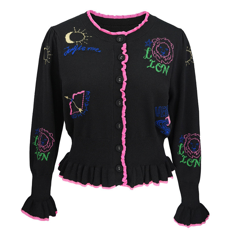 📚 JUNGLE ME圆领提花复古星座针织长袖开衫提花玫粉木耳边黑色毛衣