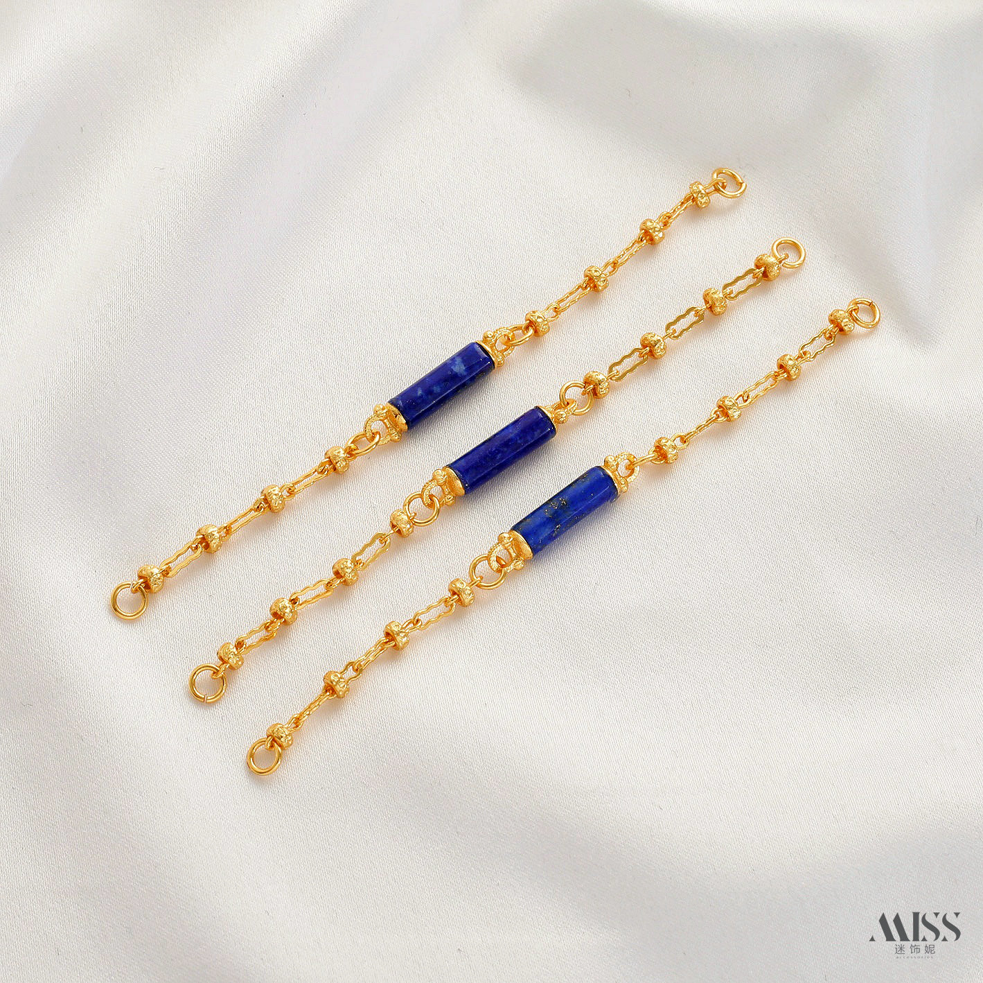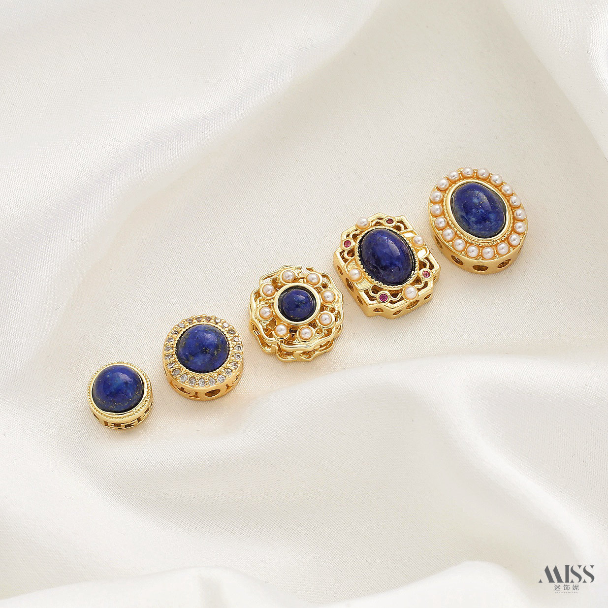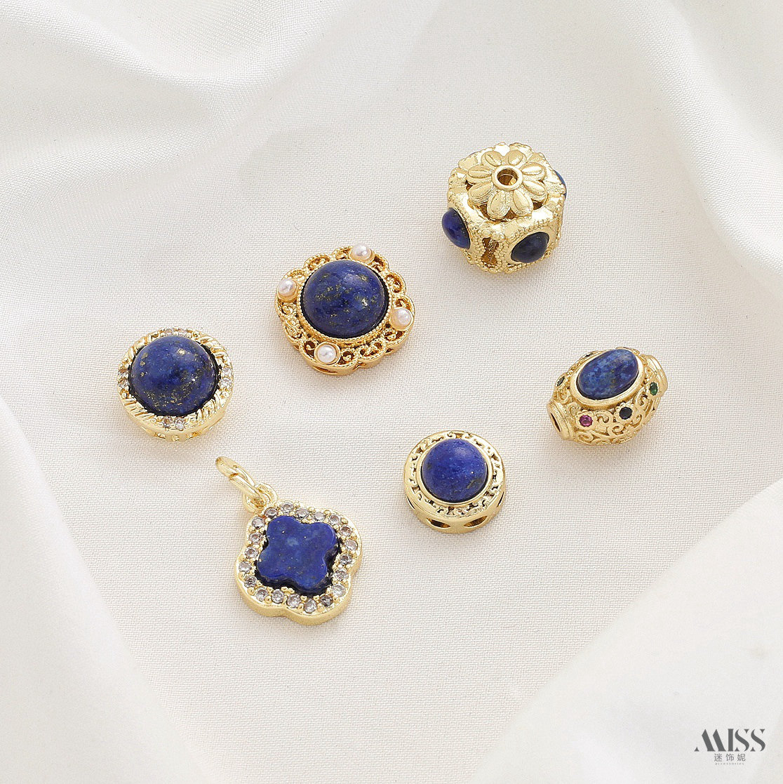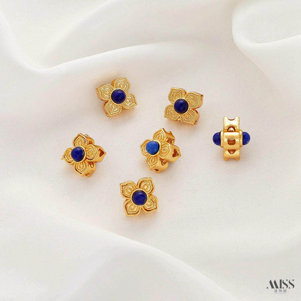 📚 镶嵌天然青金石铜镀真金花式镂空隔珠四叶草吊坠短链diy饰品配件