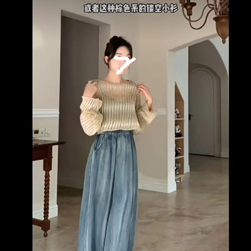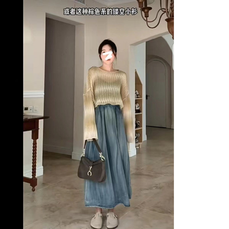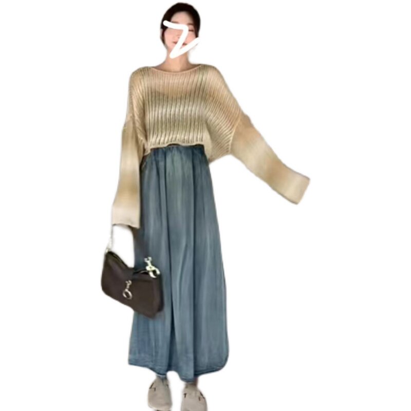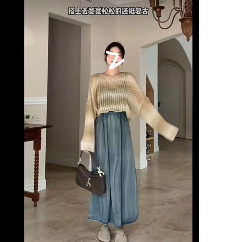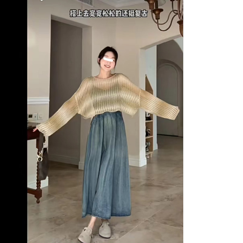 📚 九九呢杏黄色渐变长袖短款大落肩袖针织衫T恤女夏新款百搭上衣