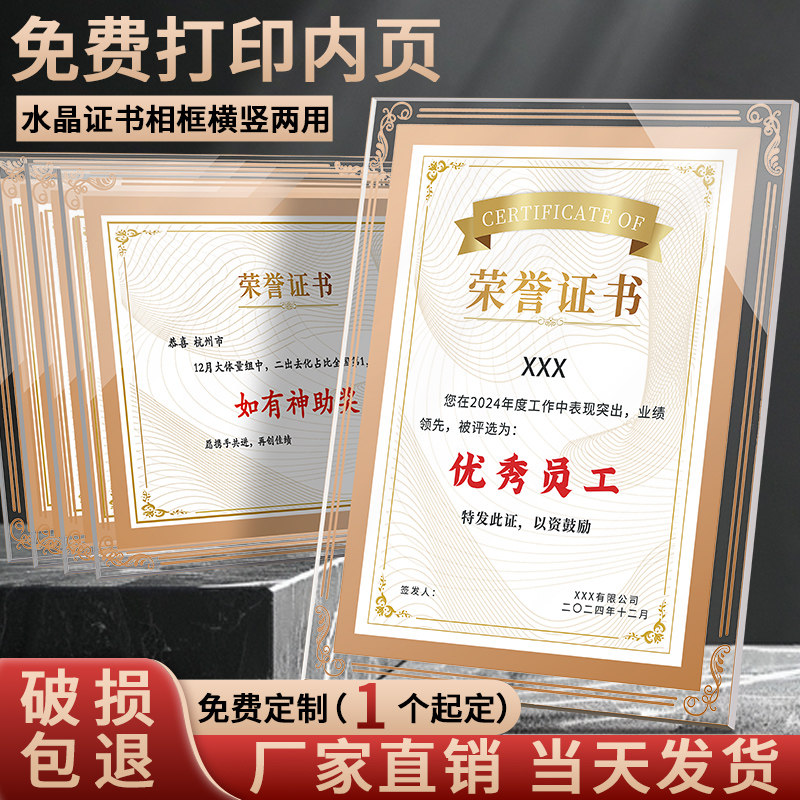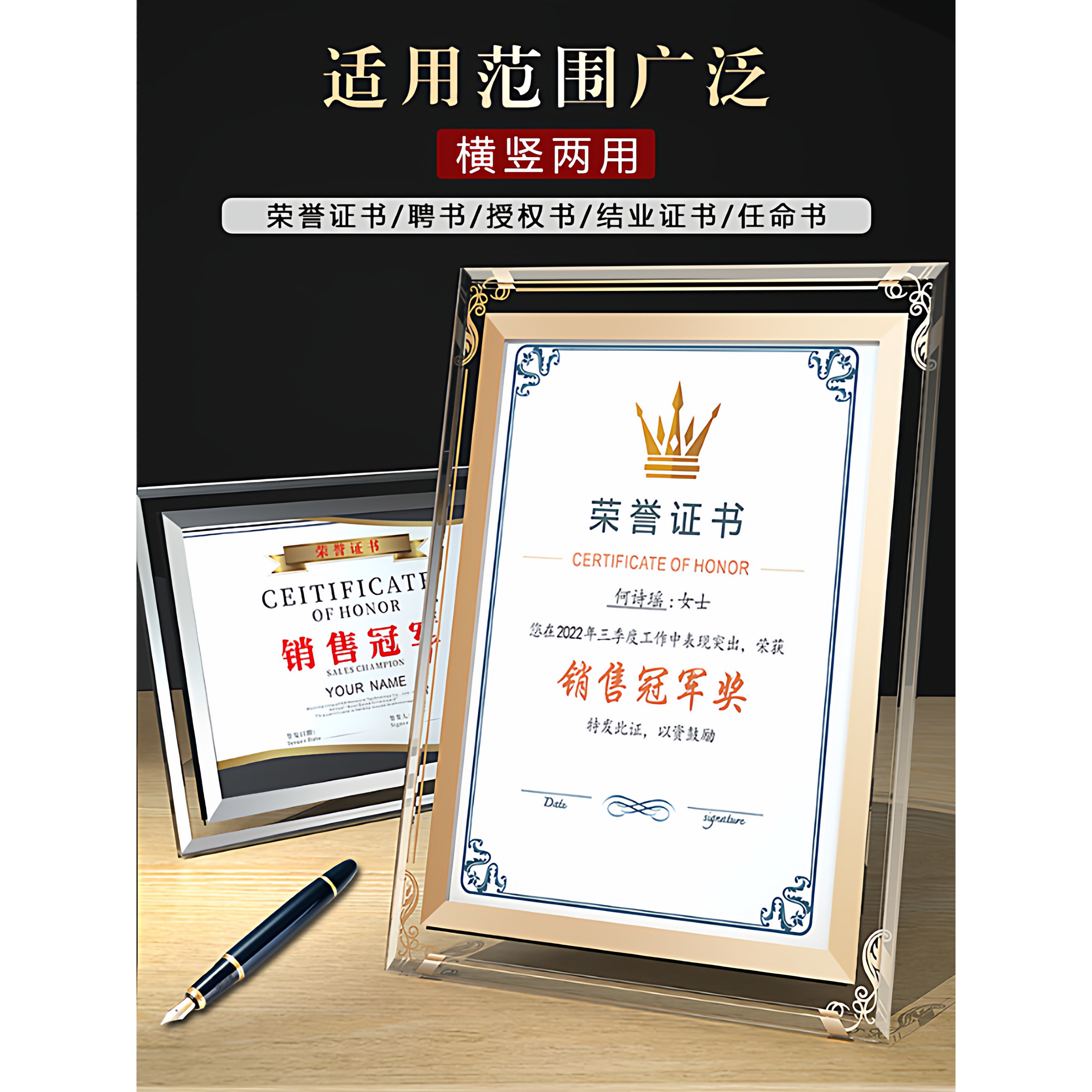 📚 荣誉证书水晶玻璃证件书相框a4获奖证书外壳企业优秀员工奖状展示框聘书专利授权结业证书打印奖牌奖杯定制